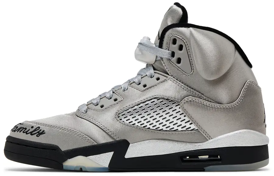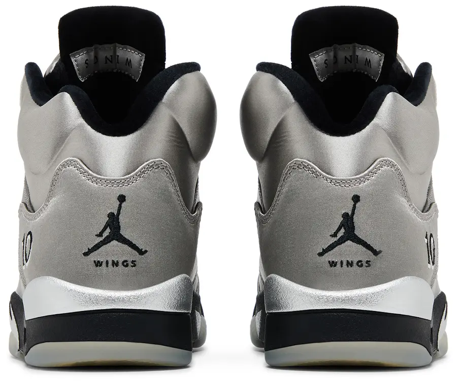 The Women’s Air Jordan 5 Retro ‘Wings’ celebrates the 10-year anniversary of Jordan Brand’s scholarship program. The silver satin upper features grey molded eyelets and breathable quarter panel netting. ’10’ is embroidered on the lateral heel, while an inscription across the toe of each shoe reads ‘In This Family No One Flies Alone.’ Standard Jumpman branding adorns the tongue and back heel, where the logo is accompanied by ‘Wings’ branding.