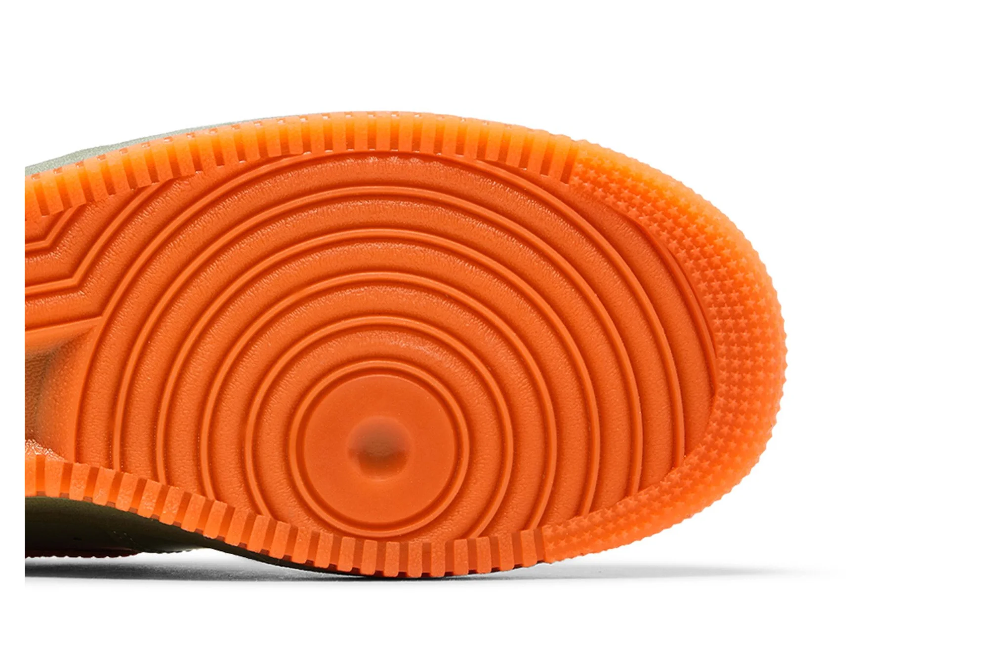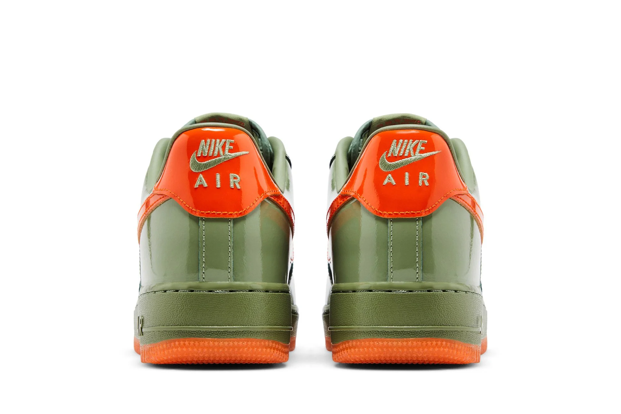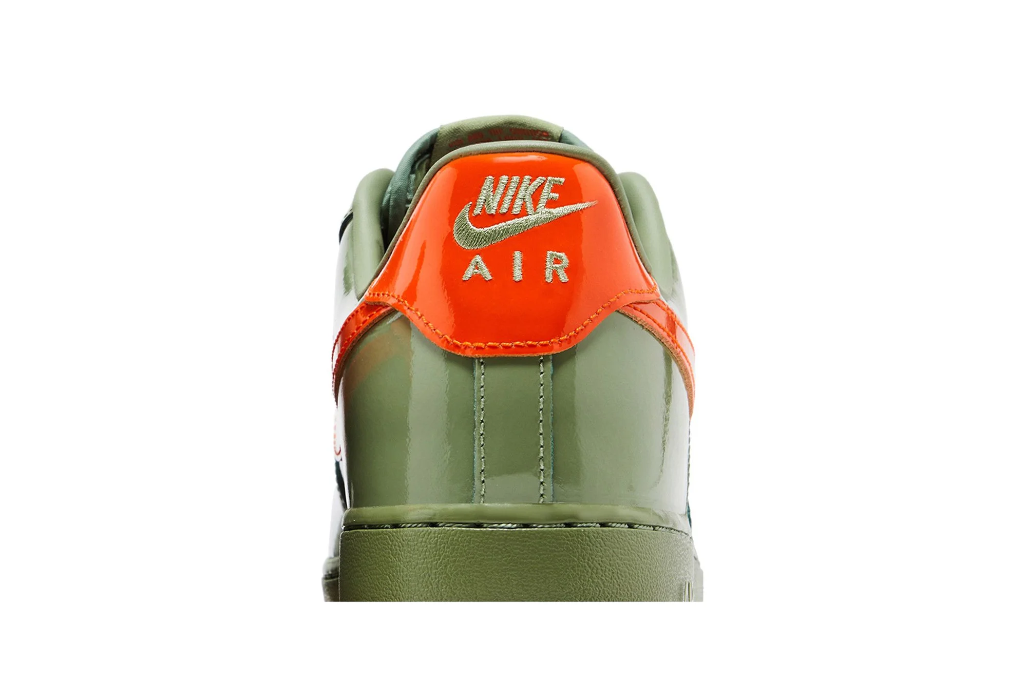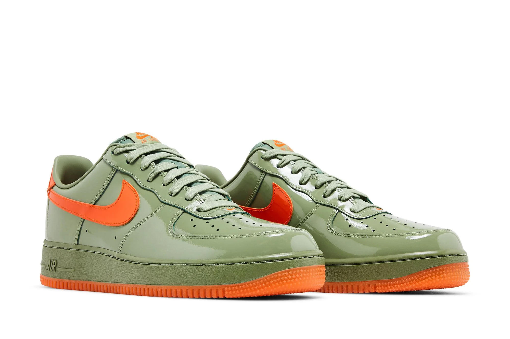 The Nike Air Force 1 Low ’07 Premium ‘Oil Green Safety Orange’ showcases glossy patent leather in a neutral green hue on the upper, contrasted by vibrant orange accents on the signature Swoosh and Nike-branded back tab. A padded low-cut collar provides a comfortable fit, while perforated detailing on the toe box offers improved breathability. The sneaker is mounted on a durable rubber cupsole, highlighted by green sidewalls and a grippy orange outsole.