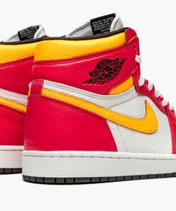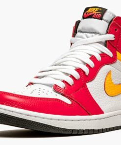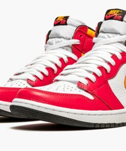 The Air Jordan 1 High OG “Light Fusion Red” is a June 2021 makeup of Michael Jordan’s iconic first signature shoe in a colorway that easily draws attention. Bold Light Fusion Red tumbled leather graces the forefoot, eyelets, collar, and heel. The shoe’s base is a bit more toned down in comparison, displaying a white leather construction. A Laser Orange leather Swoosh appears on either side. The same orange-yellow shade of leather is located on the collar. A gradient orange-to-red “Nike Air” logo appears on the black tongue tag. Underfoot, a white rubber midsole and contrasting black outsole complete the look. Release date: June 21, 2021.