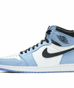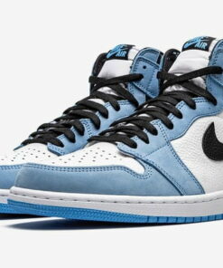 Air 1 High OG University Blue Sneakers Just A Quick Store is simple-style sneakers using retro colors. The sole is mesh, perforated, and cushioned to allow air to circulate. The outsole of sneakers is made from rubber, which can help prevent slipping. The upper part of the sneakers is decorated with twists and stitches using elastic thread combined with a retro color border. The front of the sneakers has padding and eyelet holes.