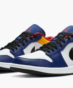 The Air Jordan 1 Low “Deep Royal/Yellow” is a colorful look for Michael Jordan’s first signature shoe in low-top height. The upper features white leather on the mid-panel and perforated toe. Deep Royal leather paneling appears on the forefoot, eyelets, and toe cap. Smooth yellow leather dots the collar and heel. A black leather Swoosh marks either side of the shoe, and navy blue “Wings” embroidery can be found on the heel. The liner displays a Track Red trim, and black cotton laces sit atop the blue nylon tongue.