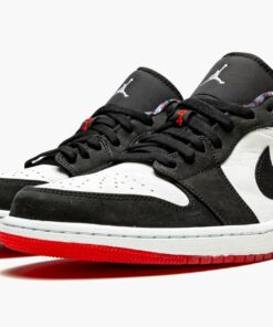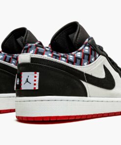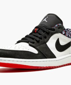 The Air Jordan 1 Low “Quai 54” is a special colorway of Michael Jordan’s first signature shoe in the low-top silhouette made exclusively for the Paris outdoor streetball tournament of the same name. A July 2021 release, the “Quai 54” edition of the Jordan 1 Low aims to “embody the strength of Quai 54 and Parsian street basketball.” On the upper, white leather appears on the base and black synthetic nubuck is found on the overlays and Swoosh. A West African-inspired pattern is located on the collar and on the Jordan Brand detailing found on the overlay on the heel. A white Jumpman is embroidered on the black nylon tongue and red “54” detailing, for Quai 54, appears on the lace overlay. Release date: July 10, 2021