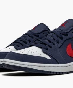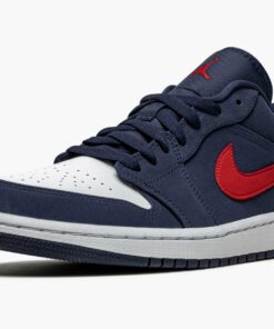 The Air Jordan 1 Low SE “USA” is a patriotic colorway of Michael Jordan’s first signature shoe in the popular low-top style. Jordan Brand’s dedication to elevating the Jordan 1 Low into the upper echelons of sneaker culture has seen the brand use the model in collaborations with Dior and Travis Scott since 2019. Here, the “USA” adds to the impressive assortment of Jordan 1 Lows by featuring the red, white, and blue color scheme of the American flag. A Midnight Navy suede material appears on the forefoot, mid-panel, collar, and eyelets. The University Red leather Swoosh logo on either side of the shoe breaks up the look. White leather can be found on the perforated toe and on the heel. A red embroidered Jumpman is stitched onto the navy blue nylon tongue. Finishing touches include a white rubber midsole and Midnight Navy outsole.
