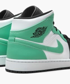 The Air Jordan 1 Mid “Island Green” is a tropical inspired look for the popular mid-top edition of Michael Jordan’s first signature shoe. Taking inspiration from the color block of the Air Jordan 1’s “Bred Toe” colorway, an original and iconic look that was released by Nike in 1985, the “Island Green” features black leather on the forefoot and lower eyelets and white leather on the perforated toe and mid-panel. Tropical Island Green leather graces the upper eyelets, collar, heel, and Swoosh branding found on both sides. A black “Wings” logo can be found on the collar and an Island Green accented Jumpman with “Air” underneath appears on the black nylon tongue tag. A black nylon tongue and laces allow for the aforementioned branding to attract attention. Jordan Brand rounds out the look with a white rubber midsole and black outsole. This colorway is being compared favorably to the rare “Igloo” Air Jordan 1 High.