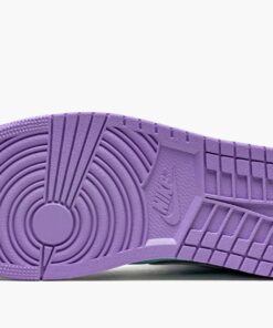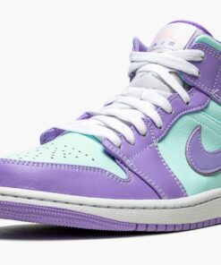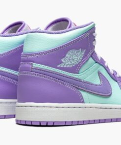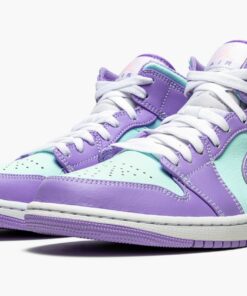 The Air Jordan 1 Mid “Purple Pulse/Glacier Blue” is a bold colorway of Michael Jordan’s first signature shoe that stands out from the crowd. Cutting an Easter-ready look, the “Purple Pulse/Glacier Blue” is dressed in a two-tone color block of pastel purple and mint green. The forefoot, eyelets, collar, heel, and Swoosh are displayed in Purple Pulse tumbled leather. Jordan Brand contrasts the look with Glacier Blue leather on the perforated toe, mid-panel, collar, and “Wings” detailing. A pink Jumpman above purple “Air” branding highlights the look of the white nylon tongue tag. White shoelaces are layered over the white nylon tongue. Underfoot, a white midsole and Purple Pulse colored rubber outsole complete the look.