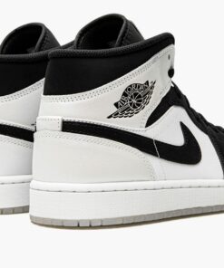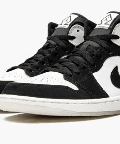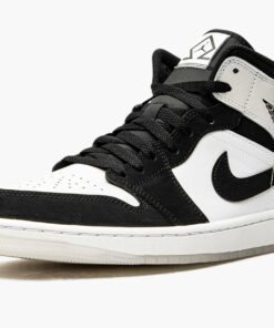 The Air Jordan 1 Mid “Diamond” is the alternate mid-top version of the colorway inspired by Air Jordan diamond basketball shorts. Released in February 2022, the “Diamond” style also appeared on the Jordan 1 Low. Design elements include a black synthetic nubuck toe cap, forefoot, eyelets, mid-panel, and collar. The perforated toe, mid-panel, collar, and heel are designed in white leather. A black “Wings” logo is embroidered on the back of the shoe. The unique “diamond” logo found on the tongue tag mimics the design of the same detailing found on the sides of Jordan Brand’s mesh basketball shorts, which are inspired by classic Chicago Bulls shorts. A white rubber midsole and milky translucent outsole complete the look.