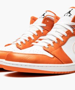 The Air Jordan 1 Mid SE “Electro Orange” is a bold colorway of the mid-top version of Michael Jordan’s first signature shoe. Despite never appearing on Michael’s feet during his time in the NBA (the Air Jordan 1 Mid debuted in the mid-2000s after he had retired from basketball), the mid-top silhouette is one of the more popular Air Jordans in Jordan’s collection, and it’s easy to see why on the “Electro Orange.” The white-and-orange color block brings to mind the classic Nike Dunk “Syracuse” from the “Be True to Your School” pack from 1985. On the “Electro Orange,” white leather appears on the perforated toe, mid-panel, collar, and Swoosh. Contrasting glossy Electro Orange leather can be found on the various overlays on the upper. A black “Wings” logo resides on the collar and a black Jumpman with “Air” branding appears on the white nylon tongue tag on the white nylon tongue. The two-tone theme continues underneath the shoe with a white rubber midsole and Electro Orange-colored outsole completing the look.