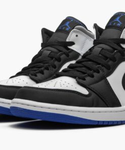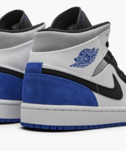 The Air Jordan 1 Mid “Game Royal Black Toe” combines two of the most recognizable colorways of Michael Jordan’s first signature shoe in the popular mid-top silhouette. The “Bred Toe” Jordan 1, which was an original colorway of the shoe from 1985, inspires the color block of the white perforated leather toe and black leather overlays on the forefoot. Branding appears in the form of a black leather Swoosh on the mid-panel and Game Royal “Wings” detailing on the white leather collar. Grey suede is located on the collar and royal blue suede dots the heel. A black nylon tongue with blue “Nike Air” branding on the black leather tongue tab completes the look of yet another stately Jordan 1 Mid. Release date: Summer 2020.