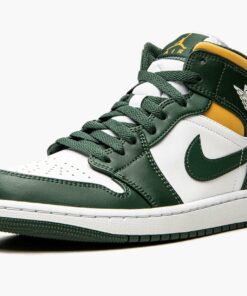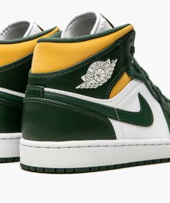 The Air Jordan 1 Mid “Sonics” is a colorway of Michael Jordan’s first signature shoe in the mid-top silhouette that features the former team uniform colors of the Seattle Supersonics. The now-defunct Sonics, who relocated to become the Oklahoma City Thunder in the late 2000s, wore green-and-yellow team uniforms and were among the most popular basketball teams in the NBA back in the day. The “Sonics” Jordan 1 Mid unofficially honors the team with Noble Green leather overlays against a white leather base. A green leather Swoosh resides on either side of the shoe. A white “Wings” logo is found on the collar and white Jumpman and “Air” detailing appears on the green leather tongue tag. A Pollen-colored collar adds to the Sonic-inspired look.