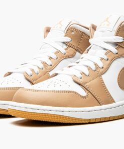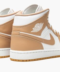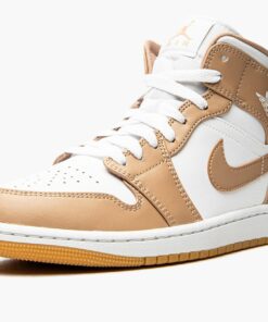 The Air Jordan 1 Mid “Tan/Gum” is a two-tone, white-and-tan colorway of the popular mid-top version of the retro basketball shoe. The Fall 2021 “Tan/Gum” edition of the Jordan 1 Mid excels in wearability with a clean and casual color block featuring white leather on the perforated toe, mid-panel, and collar. The forefoot, eyelets, collar, and Swoosh are displayed in tan-colored leather. A white Wings logo appears on the collar and a tan Jumpman and Air branding can be found on the white nylon tongue. Underfoot, the white rubber midsole is contrasted by a gum-colored outsole for a timeless look.