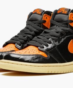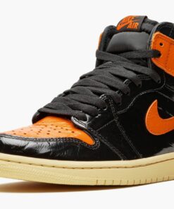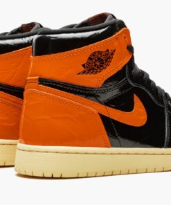 The Air Jordan 1 OG “Shattered Backboard 3.0” is the third release of the immensely sought-after “Shattered Backboard” colorway of the Air Jordan 1. The “Shattered Backboard” theme draws inspiration from an exhibition game in Italy in which Michael Jordan played during his rookie season. During the game, Jordan famously broke the glass of the backboard following a monstrous dunk. The first two iterations of the “Shattered Backboard” were a success due to their use of premium materials and eye-catching orange and black colorways. The “Shattered Backboard 3.0” falls in line with previous versions of the sneaker and adds new design features to stand out on its own. One noticeable difference is that a crinkled glossy patent leather upper replaces the leather found on the first two “Shattered Backboard” models. The black crinkled glossy leather is featured on the mid-panel, toe, and ankle collar. Pale Vanilla Starfish crinkled glossy leather adds bursts of color around the toe, quarter panel, Swoosh, and lateral heel. A black leather Wings logo sits near the collar. A vintage-inspired yellow sole gives the sneaker a lovingly worn in appearance. Release date: Fall 2019.