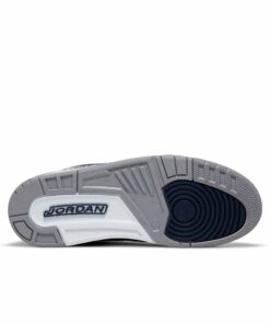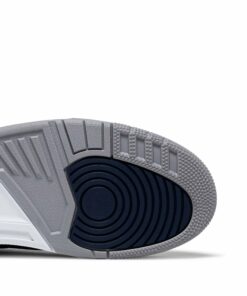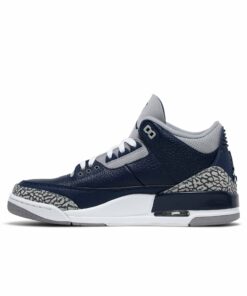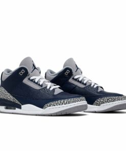 The Air Jordan 3 Retro ‘Georgetown’ is clad in the signature colors of the Hoyas, the team that Michael Jordan victimized on the way to an NCAA national championship. The classic silhouette features a navy tumbled leather upper, reinforced with signature elephant print overlays at the toe and heel. Jumpman branding hits adorn the grey synthetic leather tongue and molded navy heel panel. Lightweight cushioning is provided by a polyurethane midsole enhanced with a visible Nike Air unit under the heel.