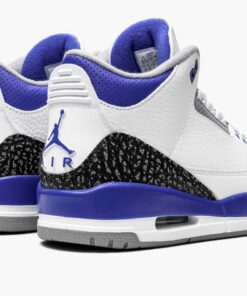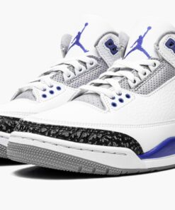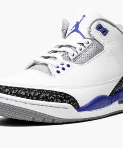 The Air Jordan 3 “Racer Blue” is a July 2021 release of Michael Jordan’s third signature shoe in a highly wearable colorway. The “Racer Blue” joins popular Air Jordan 3s like the original “True Blue” colorway and non-original “UNC” and “Knicks” colorways in featuring blue on its design. Here, white tumbled leather forms the base of the upper. Grey elephant print can be found on the toe and heel. The variation of elephant print that appears on the “Racer Blue” is darker than the material found on many Jordan 3 releases. Elsewhere, Jordan Brand places dotted Racer Blue leather on the collar. The deep blue hue also graces the painted mid-panel as well as the Jumpman on the heel and embroidered Jumpman on the white tumbled leather tongue. Racer Blue eyelets, white laces, and a visible Air bubble in the heel of the white midsole complete the look. Release date: July 10, 2021