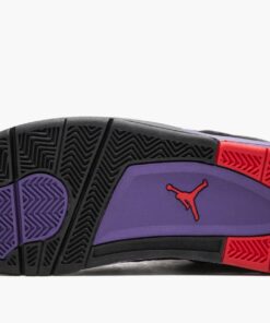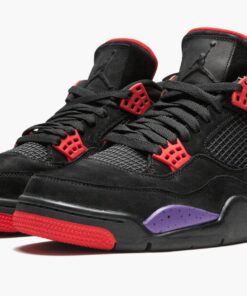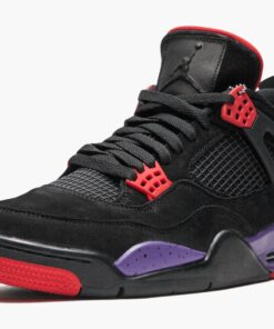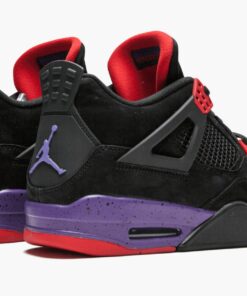 In 2018 Jordan Brand took the original black, purple, and red palette from the Air Jordan 7 and used it to create the Air Jordan 4 “Raptors.” The fierce colorway was rumored to be designed by Drake, drawing inspiration from his beloved Toronto Raptors. The Air Jordan 4 “Raptors” has a premium black suede construction with a purple speckled midsole and bright red accents.
