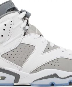The Air Jordan 6 Retro ‘Cool Grey’ brings spare, neutral tones to the classic silhouette that Michael Jordan wore when he captured the first of his six NBA championships. Accentuating the shoe’s dynamic lines is the composition of the upper, which pairs a grey nubuck foundation with leather overlays in a stark white finish. Jumpman branding adorns the lace cover and back heel, the latter captioned with embroidered ‘AIR’ lettering. Lightweight cushioning arrives via a polyurethane midsole, featuring a visible Air-sole unit in the heel and a translucent rubber outsole