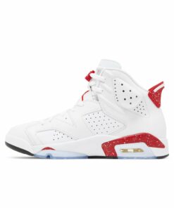 The Air Jordan 6 Retro ‘Red Oreo’ brings a simplistic two-tone palette to the classic silhouette that Michael Jordan wore when he clinched the first of his six NBA championships. The mid-top sports a white leather upper with perforated detailing and a tonal Jumpman logo embroidered on the back heel. Covered in white speckles, crimson accents appear on the molded pull tab and polyurethane midsole, featuring an exposed Air-sole unit in the heel and a translucent rubber outsole underfoot.