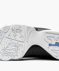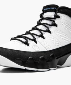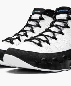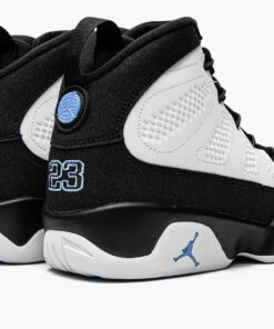 The Air Jordan 9 “University Blue” is a clean look for Michael Jordan’s ninth signature shoe that draws comparisons to the original “UNC” or “Powder Blue” colorway from 1994. Collectors may recall “His Airness” suiting up in his old UNC Tarheels team uniform while wearing the OG “Powder Blue” Jordan 9 for Nike advertisements during his brief hiatus from the NBA in the mid ‘90s, and the “University Blue” design pays homage to the “UNC” theme with subtle accents. The upper features a white leather construction with a “diamond” motif appearing along the medial and lateral sides of the shoe. A speckled black synthetic nubuck mudguard above the black painted midsole breaks up the look. Elsewhere, black rubber eyelets and rope laces contrast the white mesh tongue. Branding appears on the form of University Blue “23” embroidery on the heel and “Air Jordan” on the tongue. Additional “UNC” inspired accenting can be found on the mini Jumpman emblem on the sole and on the “globe” insignia on the heel. A black nylon pull tab on the heel and inner bootie lining complete the look of the Jordan 9 “University Blue.” Release date: December 5, 2020.