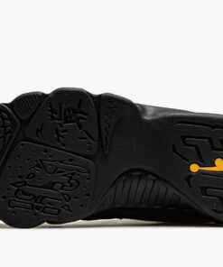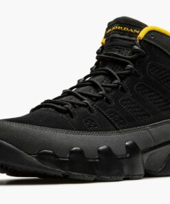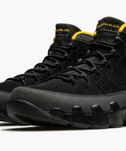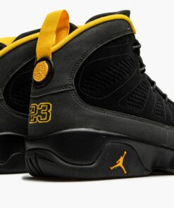 The Air Jordan 9 “University Gold” is a January 2021 colorway of Michael Jordan’s ninth signature shoe. Sneaker collectors may find similarities between the “University Gold” and “Citrus” colorway that originally debuted in July 2010. Like the “Citrus,” the “University Gold” makes use of a predominantly neutral design with subtle pops of orange, or in this case, yellow. That’s where the similarities between the two coveted sneakers comes to an end. The rest of the “University Gold” displays a black synthetic nubuck construction with a “diamond” motif appearing along the medial and lateral sides of the shoe. A grey synthetic nubuck mudguard above the black midsole breaks up the look. Contrasting University Gold accents on the liner, pull tab, and “Air Jordan” branding on the tongue add a subtle but welcoming burst of color to the look. The same yellow hue can be found on the embroidered “23” branding on the heel and Jumpman insignia on the sole. A mini “globe” emblem on the back of the shoe finishes off the design of the Air Jordan 9 “University Gold.” Release date: January 30, 2021.