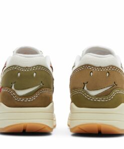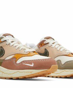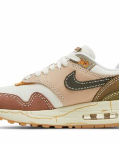The Nike Air Max 1 Premium Air Max Day Wabi Sabi Womens sneaker provides a superbly eclectic fabric upper in a variety of colours and layered panels for a unique look you’ll want to show off time and again. The premium upper focused on soft nubuck, with a rose pink offering wrapping around the toe, a chocolate brown strip towards the back heel, a lighter brown wrap around the back, baby pink panelling across the mid and eyestay sides and complete with a deep brown for the side Nike Swoosh. All panels are complete with extra-large stitch detailing in white, as well as extra red stitching towards the back. The toe also comes with a mini Nike Swoosh in white, while the chunky sole comes in creamy rubber displaying a visible Air unit to the back.
