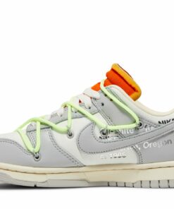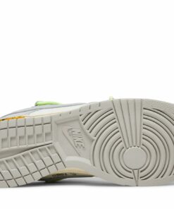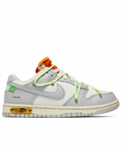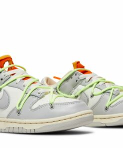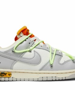 Creatively collaborative, the Nike Dunk Low x Off-White Dear Summer – 43 of 50 is a part of the broad 2019 ‘Dear Summer’ collection. Its smooth white canvas base is dressed in light grey leather overlays, with a matching muted grey Swoosh dominating its sidewall. Its orange exposed-foam tongue is complemented by the matching zip-tie that’s attached to the laces in signature Off-White fashion. A decorative neon lacing system adorns the Dunk’s upper, whilst a marbled black and yellow ‘43 of 50’ badge sits upon its ivory Air-cushioned midsole. Complete with trademark Nike branding as well as printed Helvetica text across its sides, the Nike Dunk Low x Off-White Dear Summer – 43 of 50 is a complex pair that deserves a spot in your collection.