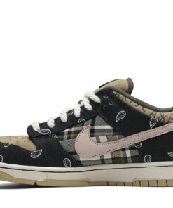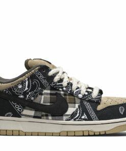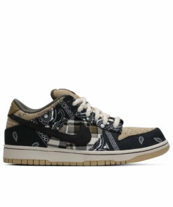 Nike has enjoyed many high-profile collaborations in recent years, and its team-up with Travis Scott is one of the most exciting yet. The iconic silhouette received a patchwork update and debuted in American rapper’s JACKBOYS music video. The tan leather toe box and medial and lateral Nike Swooshes contrast with a navy bandana overlay and tartan print quarters on the midsection. Tying together the distinctive design are the white rope-style laces, setting the sneakers apart from any other Nike SB Dunk Lows. Travis Scott has given the sneakers his seal of approval, as it features a stitched CACTUS JACK logo on the tongue tab, which is a nod to the record label he founded in 2017. The padded collar has CACTUS JACK letters in Russian, and the shoes come in a regular Nike box.