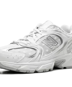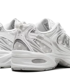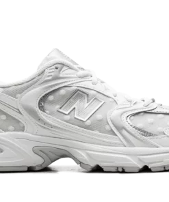 Step out in a fresh take on a classic with the New Balance 530, also known as the “Silver Metallic Polka Dots.” These sneakers offer a stylish blend of retro inspiration and modern flair. The clean white base is accented with eye-catching silver metallic detailing, creating a look that’s both timeless and on-trend. Experience all-day comfort with the cushioned design and breathable materials. Add a touch of sparkle to your everyday style with these versatile and iconic sneakers. Silver Metallic Polka Dots