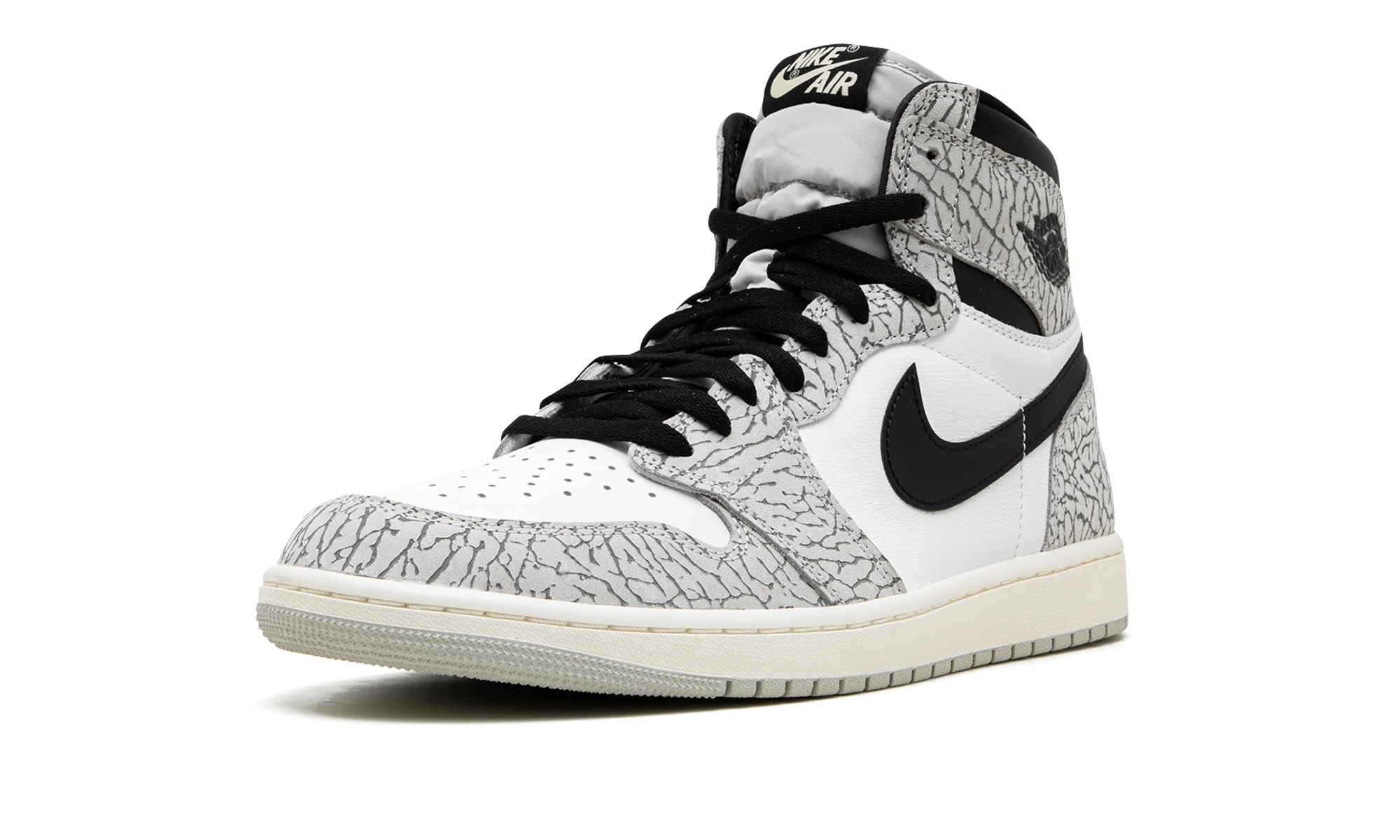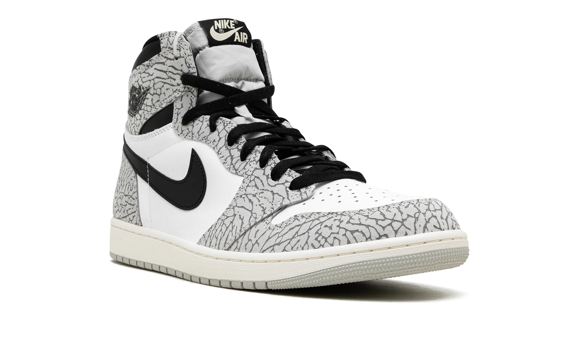 The Air Jordan 1 High OG White Cement is a colorway of the retro basketball shoe that takes inspiration from the classic elephant patterning found on the Air Jordan 3. The White Cements overlay panels feature the same iconic elephant print that debuted on the Jordan 3 in 1988. As for the rest of the design, the shoe features a white leather base with the aforementioned Cement-colored elephant print overlays. A black Swoosh appears on either side of the shoe. A black Wings logo is located on the collar and white Nike Air detailing appears on the tongue tag. Underfoot, the vintage-inspired Sail rubber midsole is paired with a grey outsole. Release date: February 25, 2023 White Cement