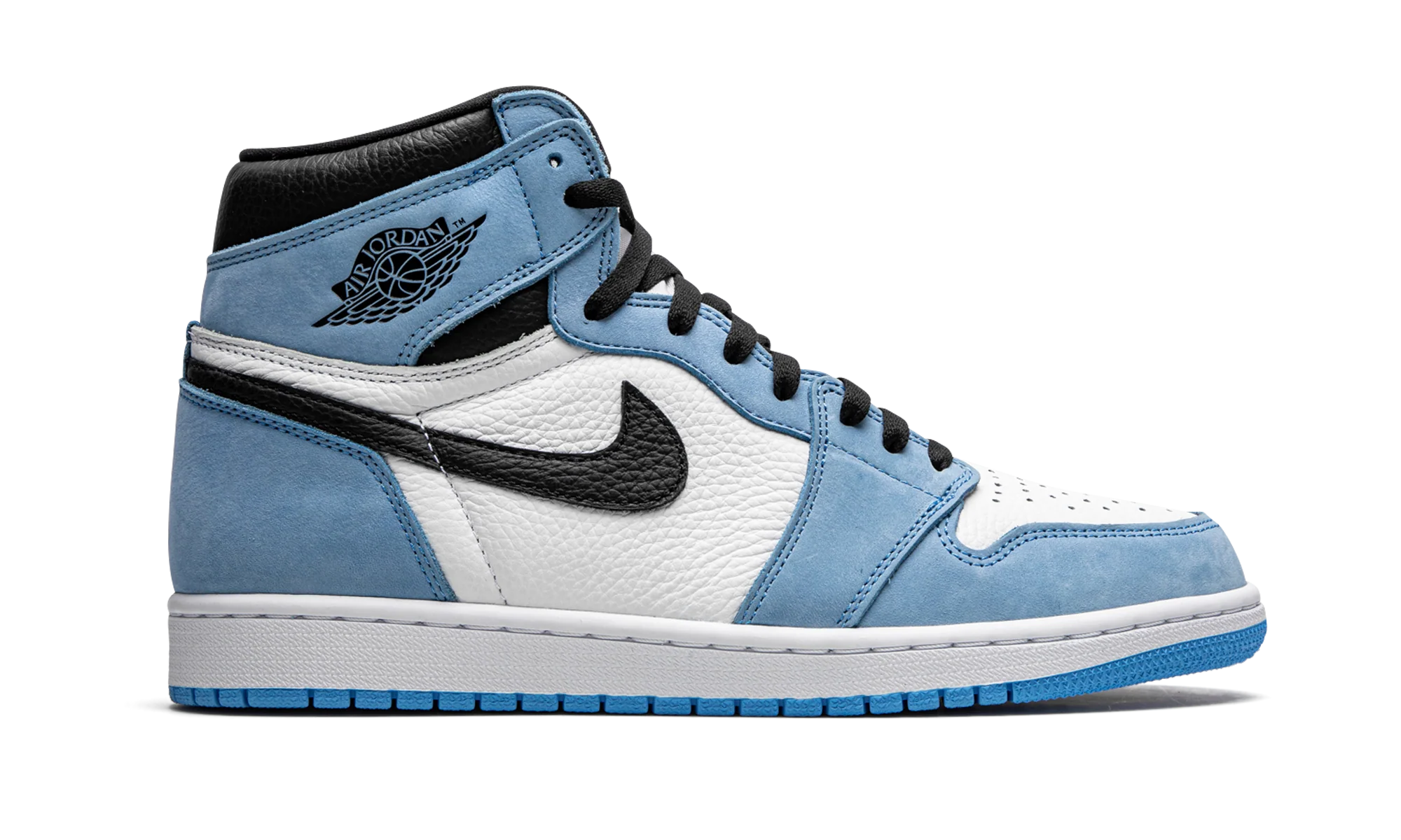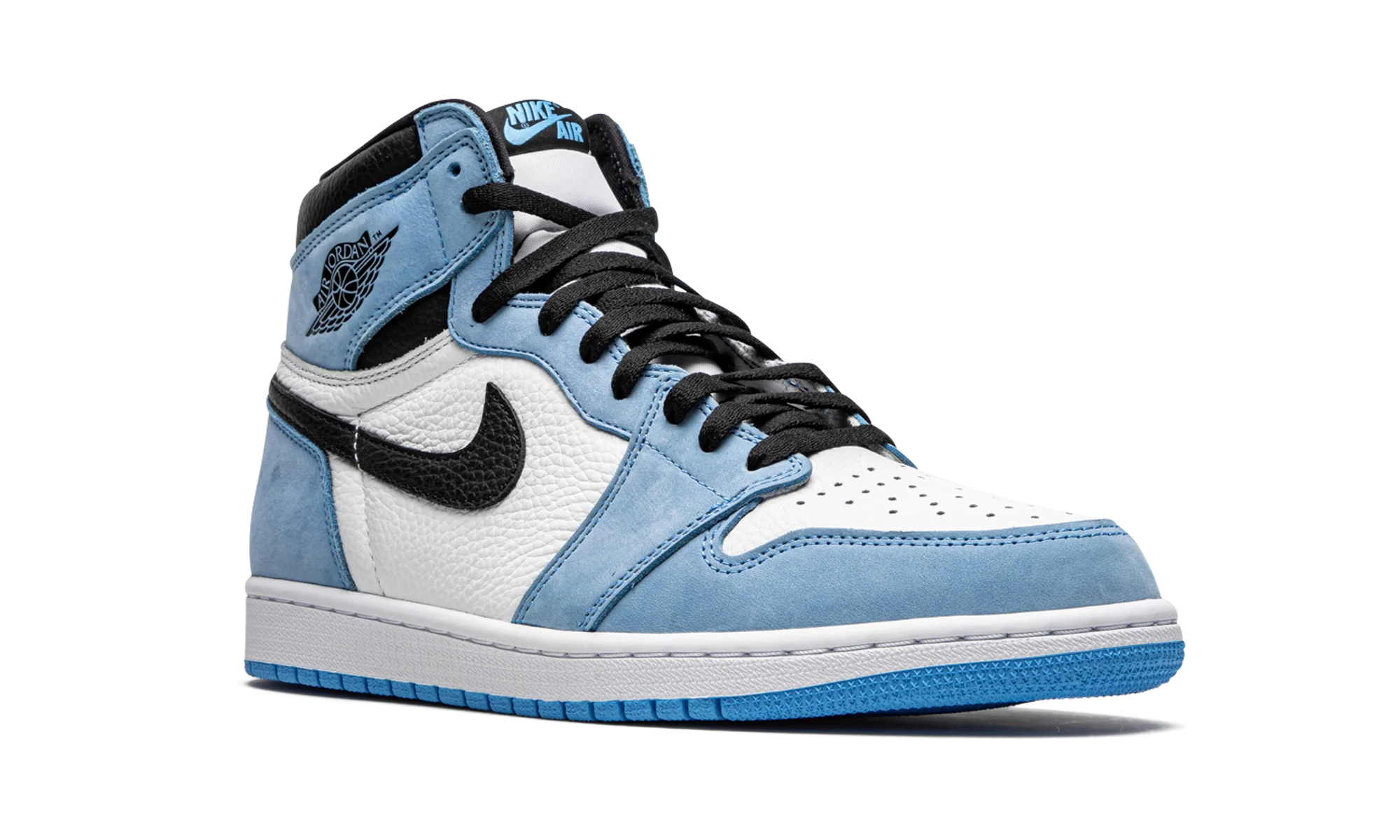 The Air Jordan 1 High University Blue is inspired by an original colorway of Michael Jordans first signature shoe. An early 2021 release by Jordan Brand, the University Blue Jordan 1 comes in the desirable high-top silhouette and recruits a mixture of materials and UNC flavored colors for an appealing design. Full-grain white leather appears on the mid-panel and perforated toe. University Blue nubuck leather overlays on the forefoot, eyelets, collar, and heel contrast the crisp white base. Jordan Brand adds a black leather Swoosh on either side and a black Wings logo to the collar. Additional details include black laces on a white nylon tongue, a light blue Nike Air logo on the black nylon tongue tag, and supple black leather on the collar. Release date: March 6, 2021 University Blue