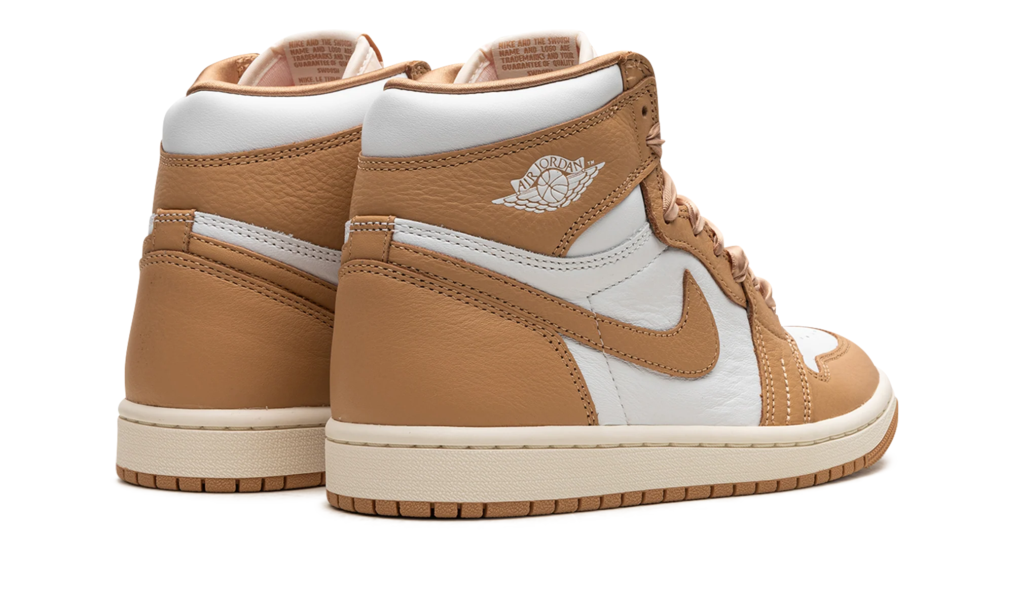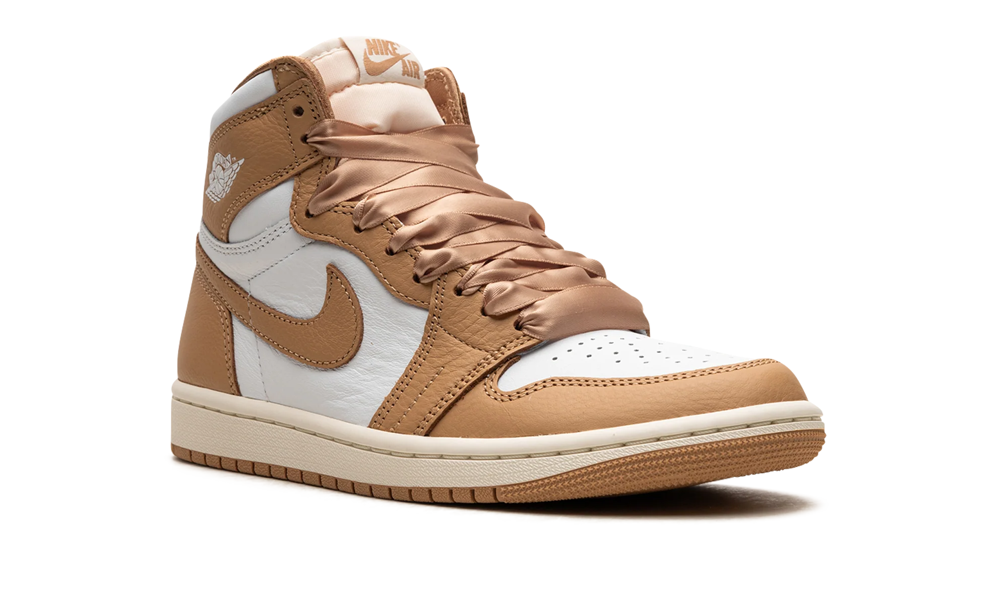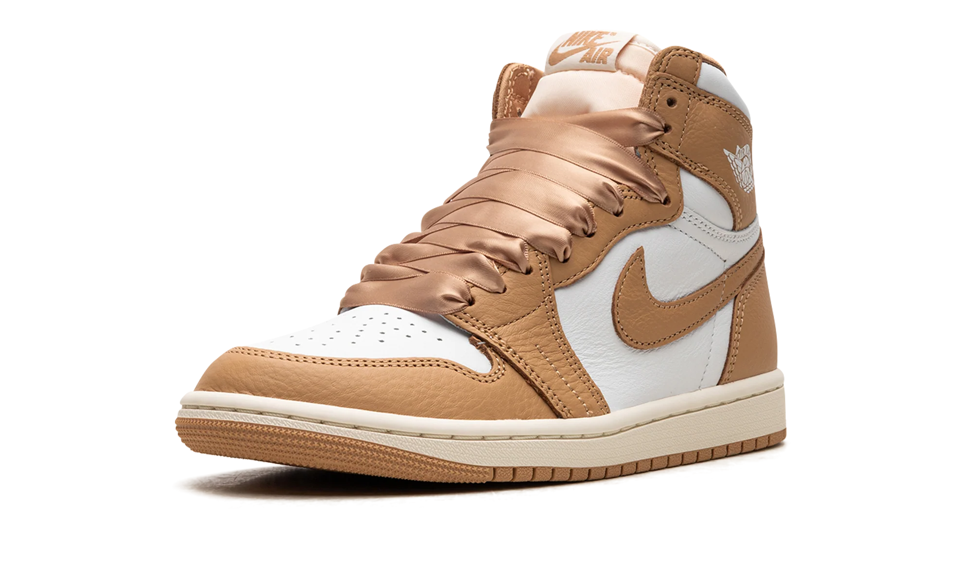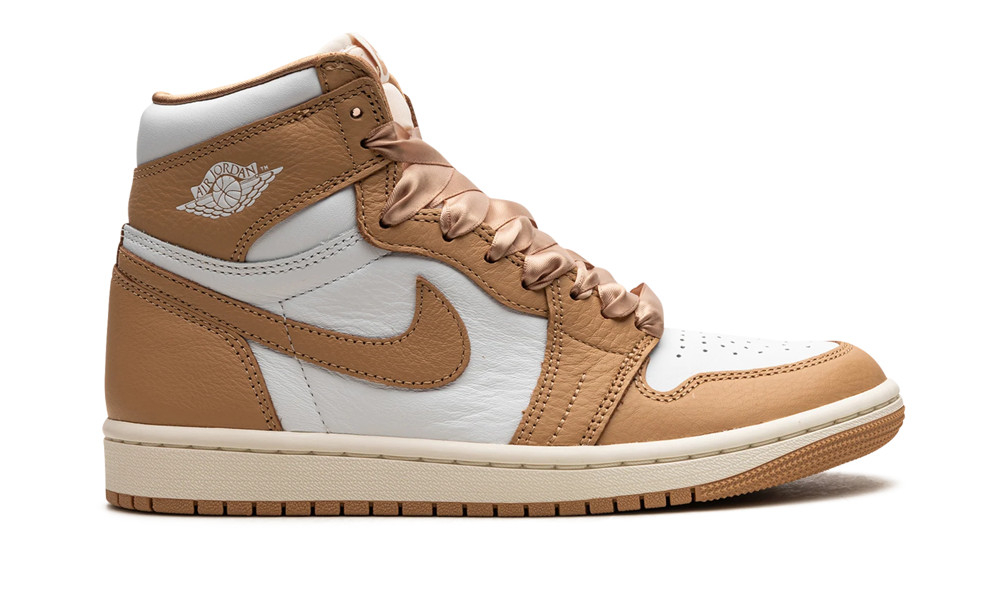 The Womens Air Jordan 1 Retro High OG “Praline” is a womens-exclusive colorway of the retro basketball sneaker inspired by luxury handbags. The striking design features a white leather base with tan leather overlays and a tan leather Swoosh on each side. Classic Wings branding appears on the collar and Nike Air and Swoosh logos are found on the tongue tag. The shoes satin-like ribbon-style laces are inspired by details on a handbag. Release date: September 13, 2023 Praline