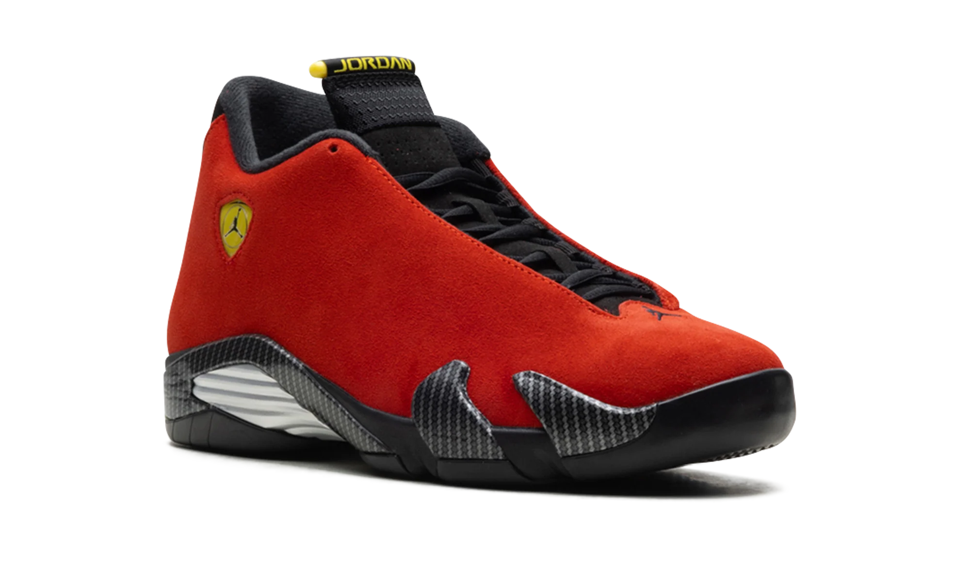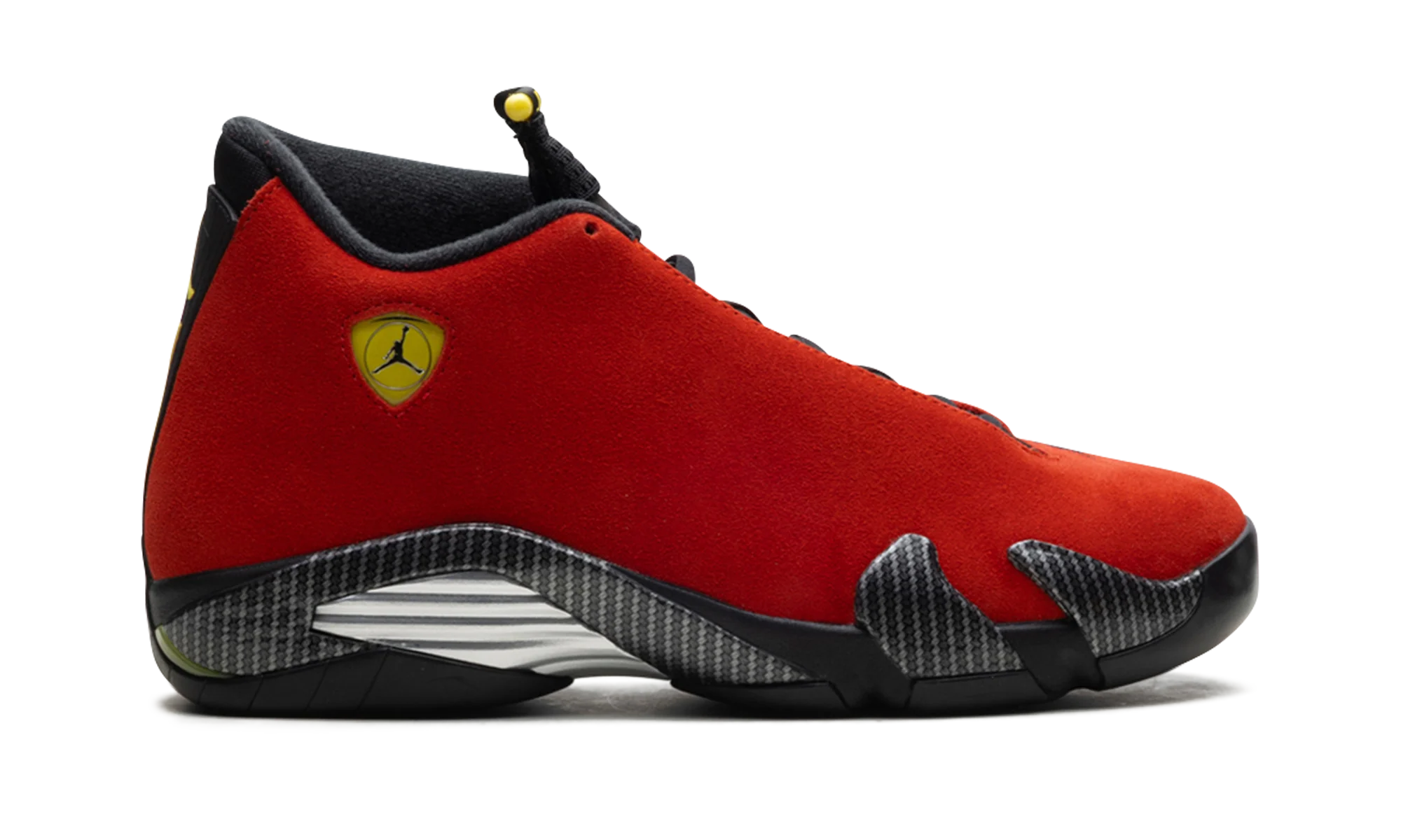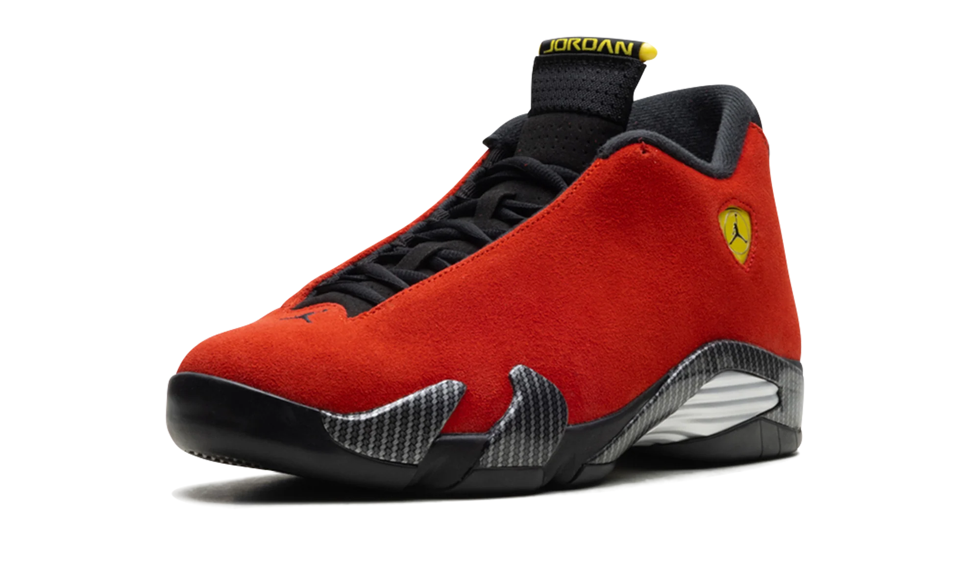 The Air Jordan 14 “Ferrari” is a 2025 colorway of Michael Jordan’s 14th signature shoe. Inspired by Jordan’s love of sports cars, the “Ferrari” AJ14 has a sleek red suede upper that is accented with carbon fiber-inspired details around the midsole. The texture on the heel tab is reminiscent of car tires, and yellow accents complete the design.