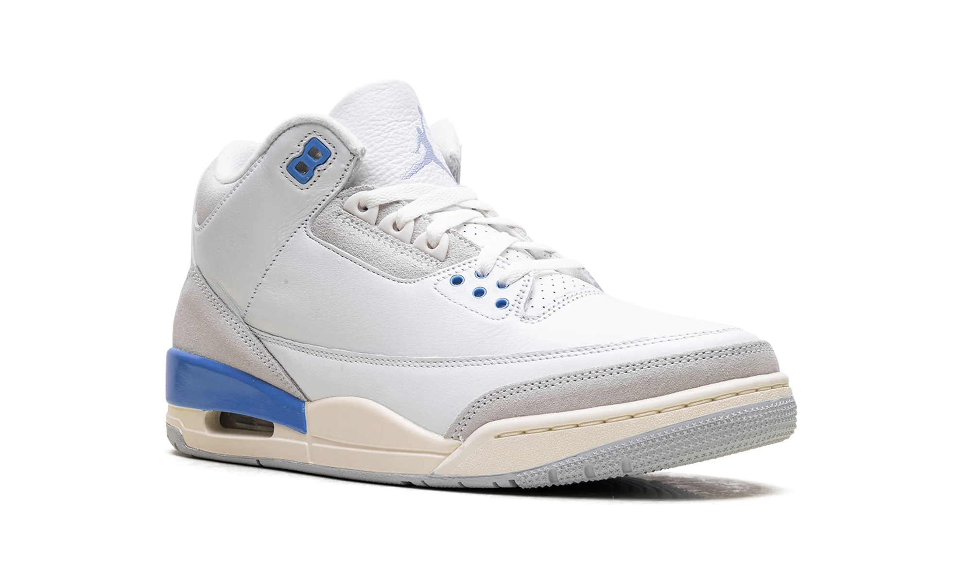 The Air Jordan 3 “Lucky Shorts” is a blue and white colorway of Michael Jordan’s third signature shoe. The “Lucky Shorts” AJ3 takes inspiration from a pair of UNC shorts that Jordan wore underneath his NBA uniform during his carer. The upper on this Jordan 3 mixes white leather with off-white suede and adds Carolina blue accents throughout. Lucky Shorts