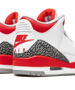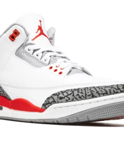 The Air Jordan 3 OG Fire Red is the 2022 release of an original colorway of Michael Jordans third signature shoe. This modern reissue of the Fire Red marks the first time the shoe has featured its iconic Nike Air branding on the heel since the original release in 1988. The upper features a white leather base with contrasting grey elephant print on the toe cap and heel. Fire Red-colored leather appears on the collar. The blazing red hue is also found on the Nike Air detailing on the heel, on the top eyelet holes, and on the Jumpman thats embroidered on the white leather tongue. Fire Red detailing also appears on the painted mudguard above the white foam midsole. A visible Air unit in the heel of the shoe completes the look. Release date: September 10, 2022 Fire Red 2022