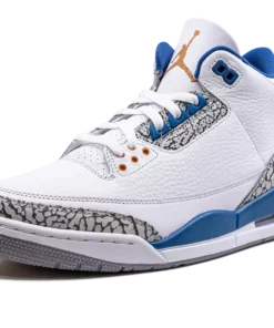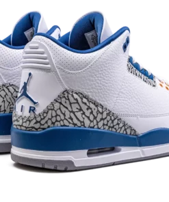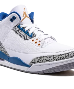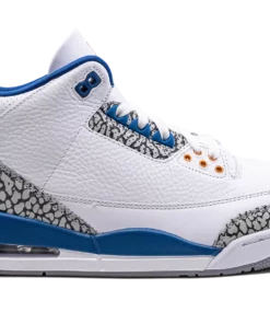 The Air Jordan 3 Wizards is the modern, retail version of the former Player Exclusive colorway of the Jordan 3 that was worn by Michael Jordan with the Washington Wizards. Originally an unreleased Player Exclusive sneaker worn by Jordan during his tenure with the Wizards in the early 2000s, the Jordan 3 Wizards was officially released by Jordan Brand in 2023 with much fanfare. The colorways white, blue, and elephant print accents nod to the Air Jordan 3 True Blues color scheme, and its gold accents salute to the Wizards former team uniform colors. The shoe features a white leather construction with classic elephant print on the toe and heel. True Blue detailing comes into play on the eyelet panel and on the mudguard. Nike Air branding is found on the back of the shoe, and a gold Jumpman is embroidered on the tongue. Release date: April 29, 2023 Wizards