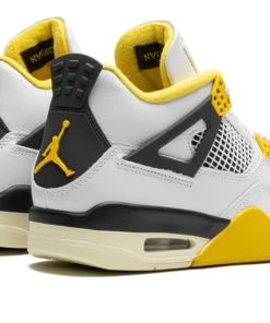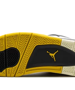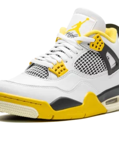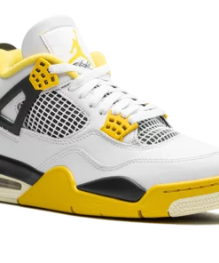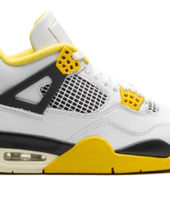 The Air Jordan 4 Vivid Sulfur is a colorway of Michael Jordans fourth signature shoe with yellow accents. Released in celebration of the Jordan 4s 35th anniversary in 2024, the Vivid Sulfur features a white leather upper with black wings and a black underlay beneath the white netting on the mid-panel and tongue. Vivid Sulfur accenting appears on the eyelet tabs, the Jumpman on the tongue, the inner lining, and on the midsole. More Vivid Sulfur detailing appears on the Jumpman on the black heel counter. Underfoot, a visible Air unit in the heel of the midsole completes the look. Release date: April 6, 2024 Vivid Sulfur