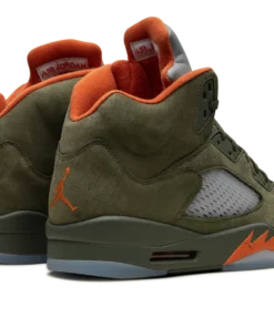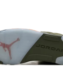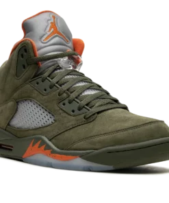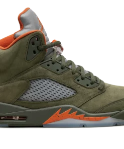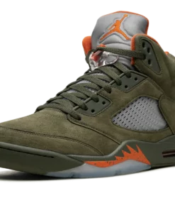 The Air Jordan 5 “Olive” is the modern re-release of the colorway of Michael Jordans fifth signature shoe that first released in 2006. An early lifestyle version of the Jordan 5, the Olive colorway was released in the mid-2000s before it was brought back for the first time in 2024. The contemporary version of the shoe is identical to the original style from 06. The shoe features an Olive suede construction with translucent netting on both the mid-panel and on the tongue. A Solar Orange Jumpman appears on the silver reflective tongue and on the heel. Additional orange accenting is seen on the inner lining and on the shark tooth detailing on the forefoot of the olive midsole. An icy blue translucent rubber outsole completes the look. Release date: March 9, 2024 Olive
