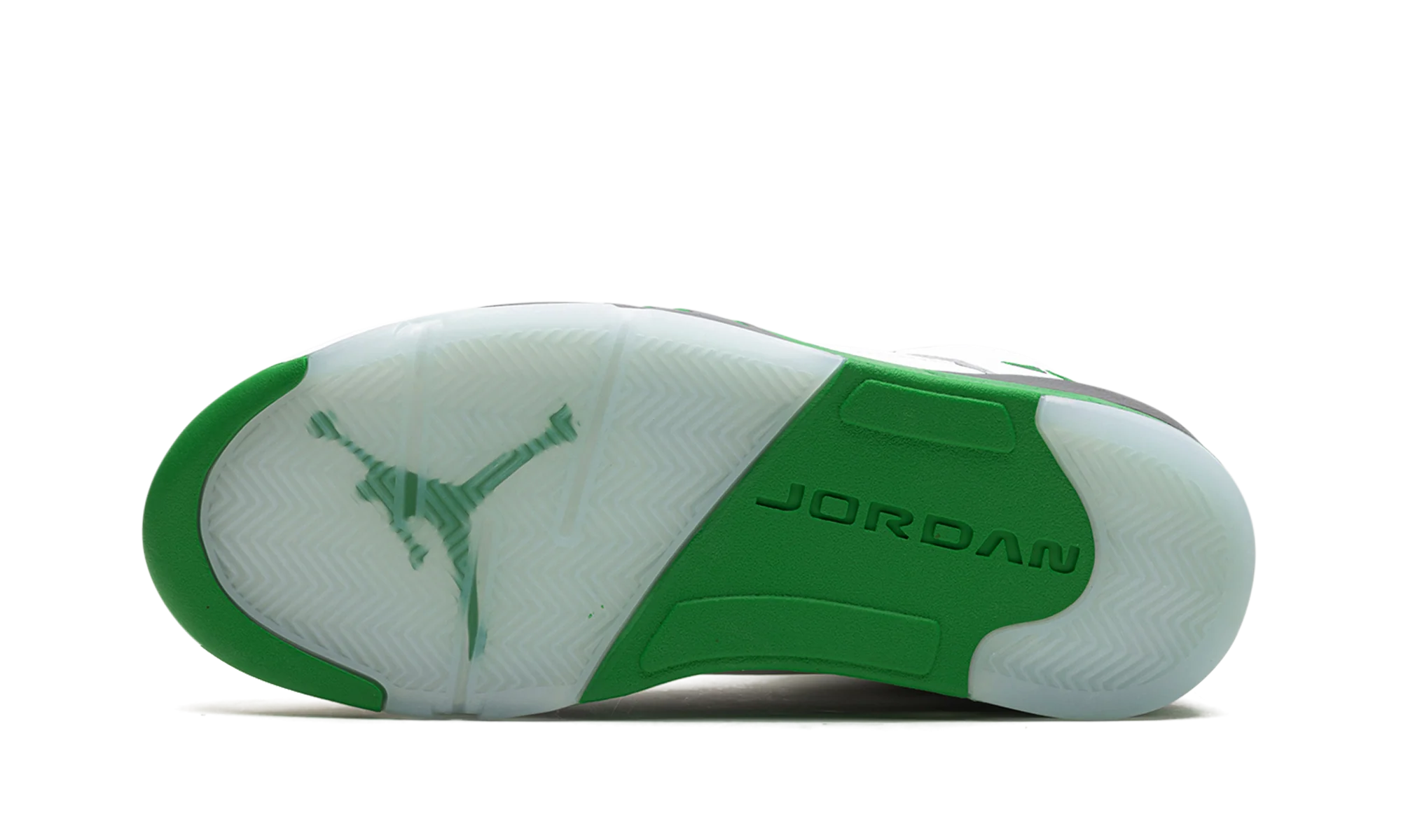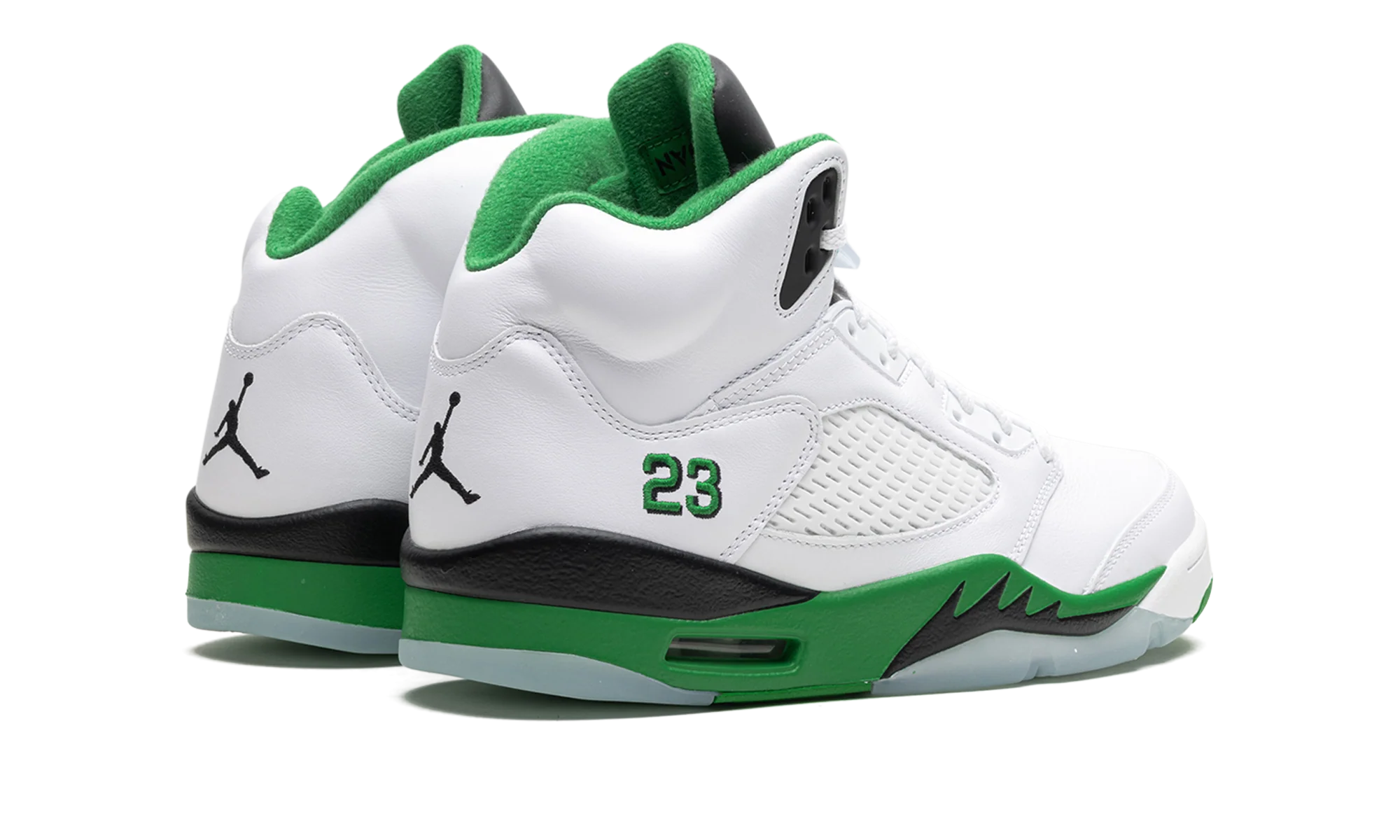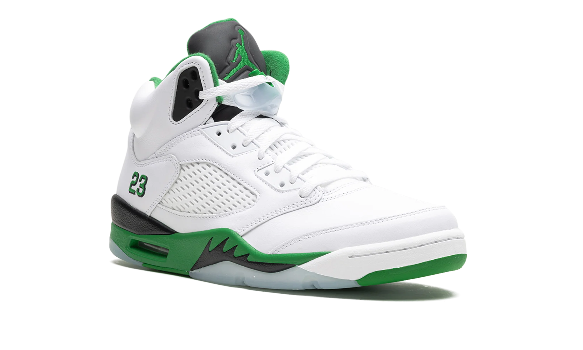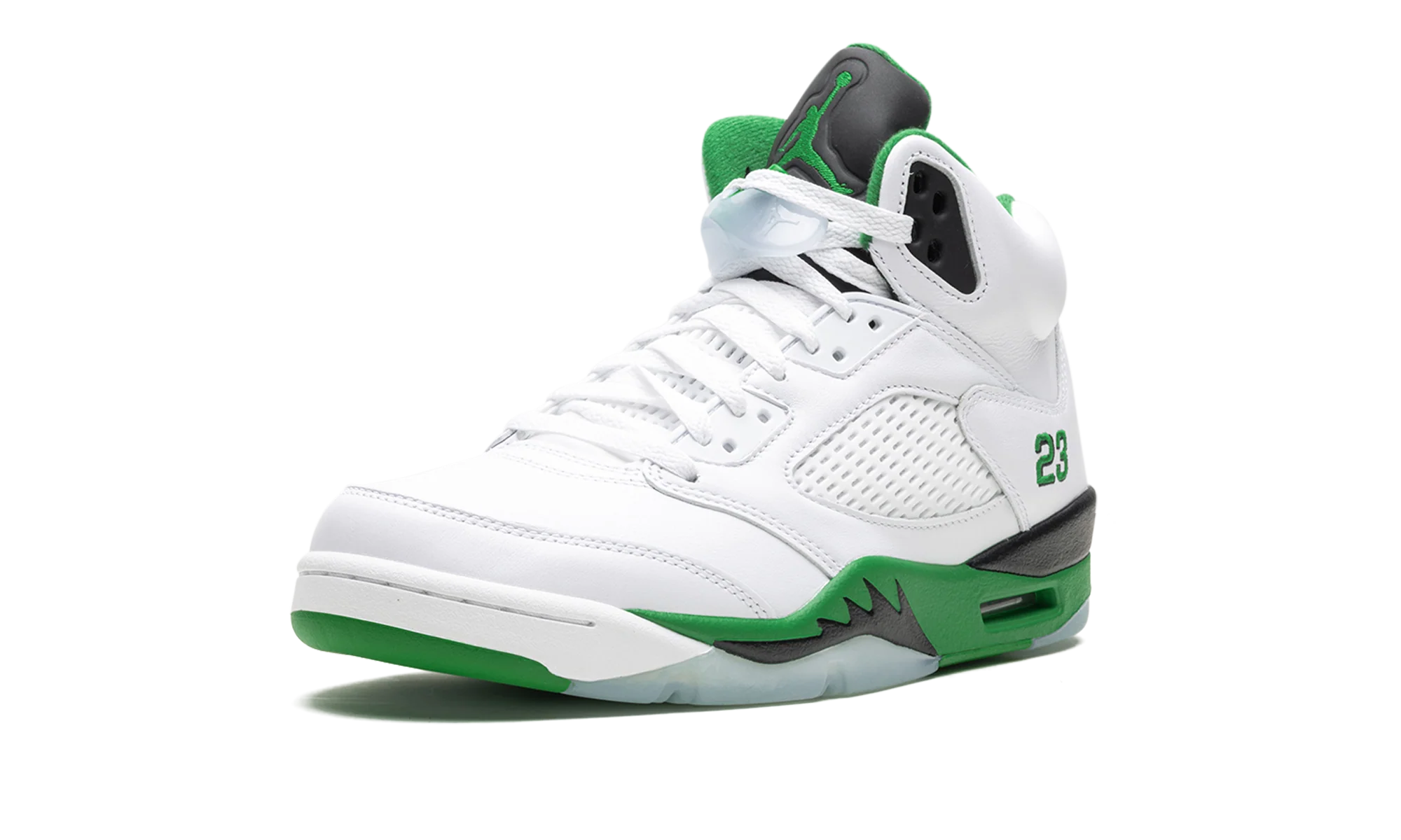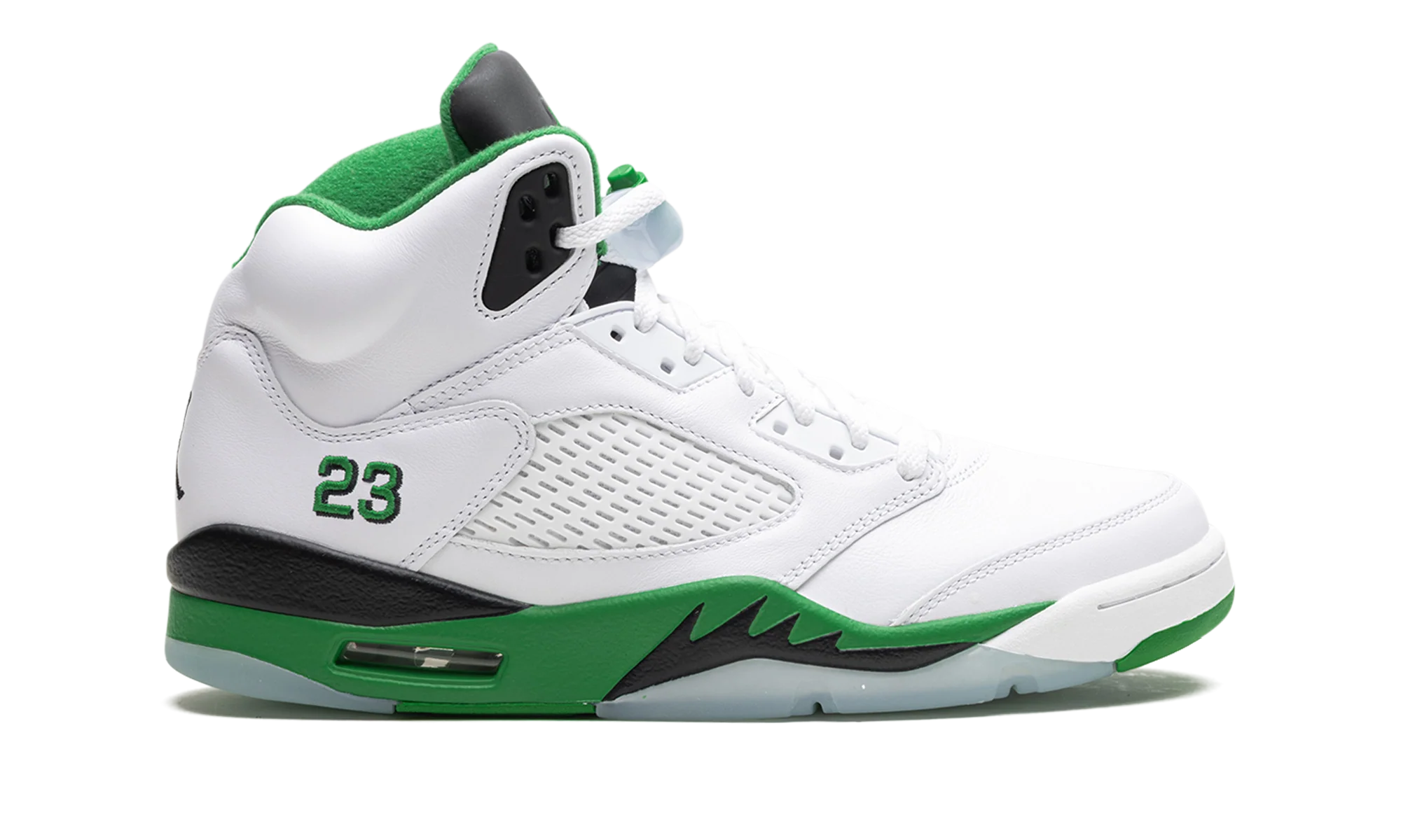 The Womens Air Jordan 5 “Lucky Green” is a womens-exclusive colorway of the retro basketball shoe with a similar color block to the Jordan 5s original Fire Red – Black Tongue style. From Jordan Brands Spring 2024 collection, the Jordan 5 Lucky Green is designed with the same color coordination as the popular and iconic Jordan 5 Fire Red – Black Tongue with Lucky Green accents instead of red detailing. The shoe has a white leather construction with translucent netting on the side and on the tongue. A Lucky Green Swoosh appears on the black neoprene tongue and Michael Jordans 23 jersey number with the Chicago Bulls appears in black and green on the lateral side of the heel. The black mudguard is paired with a Lucky Green midsole that has shark tooth detailing on the forefoot. Lucky Green