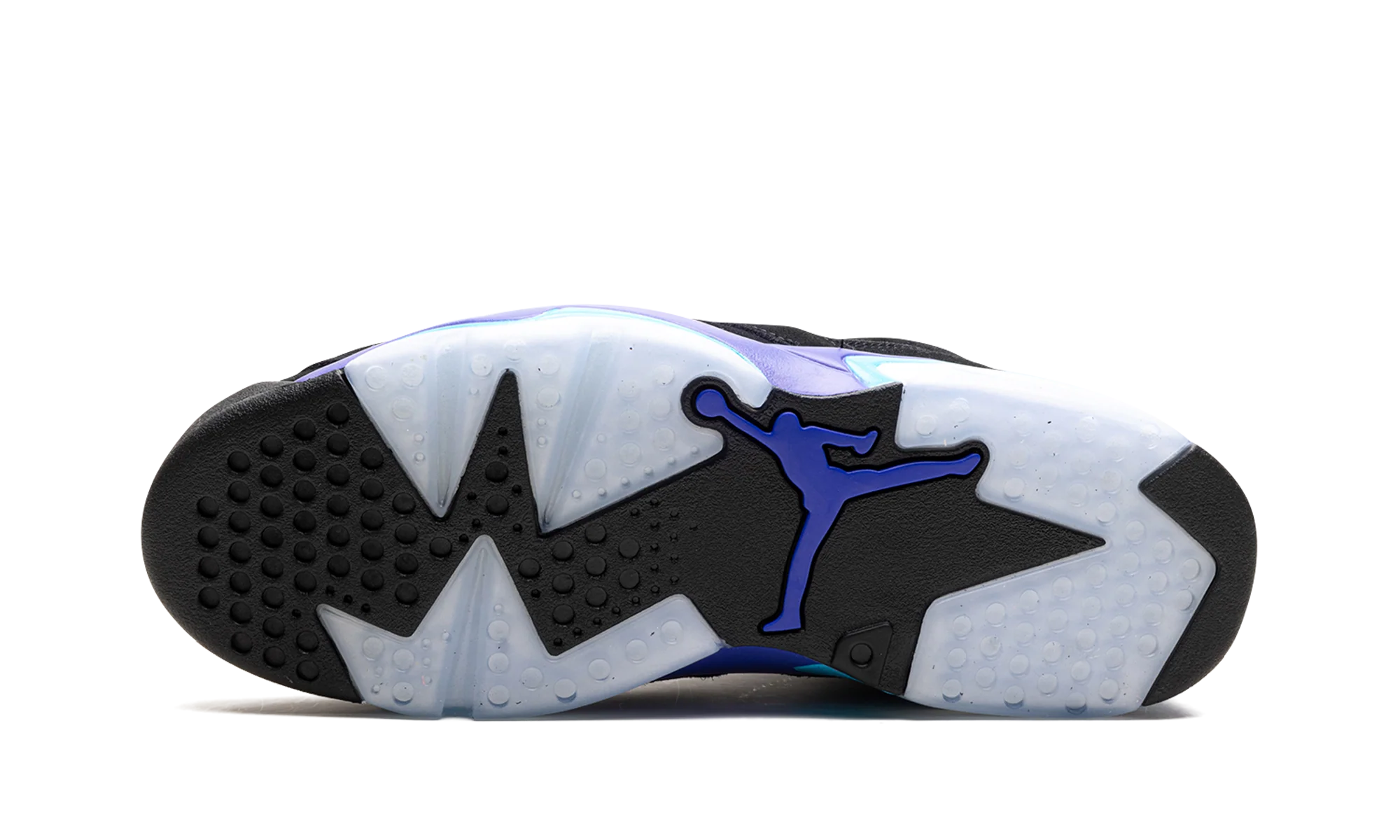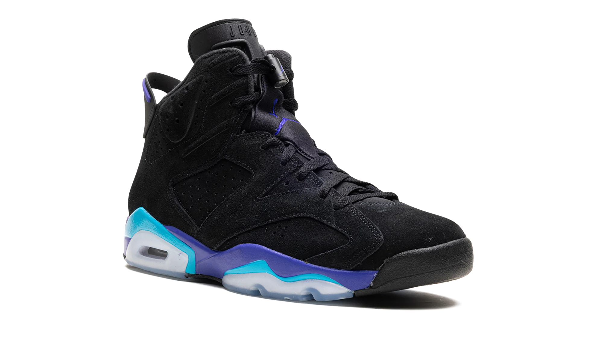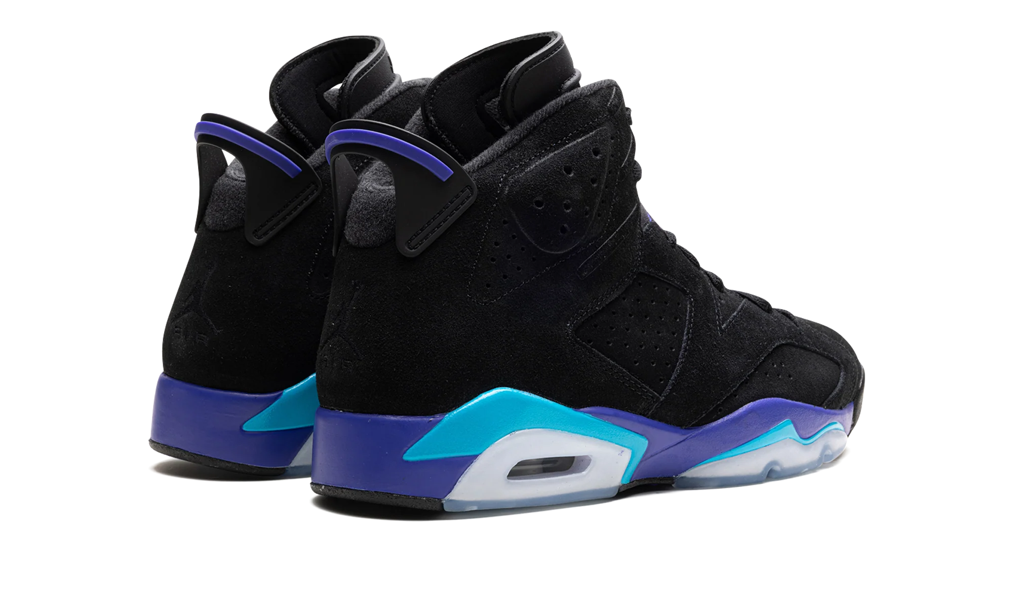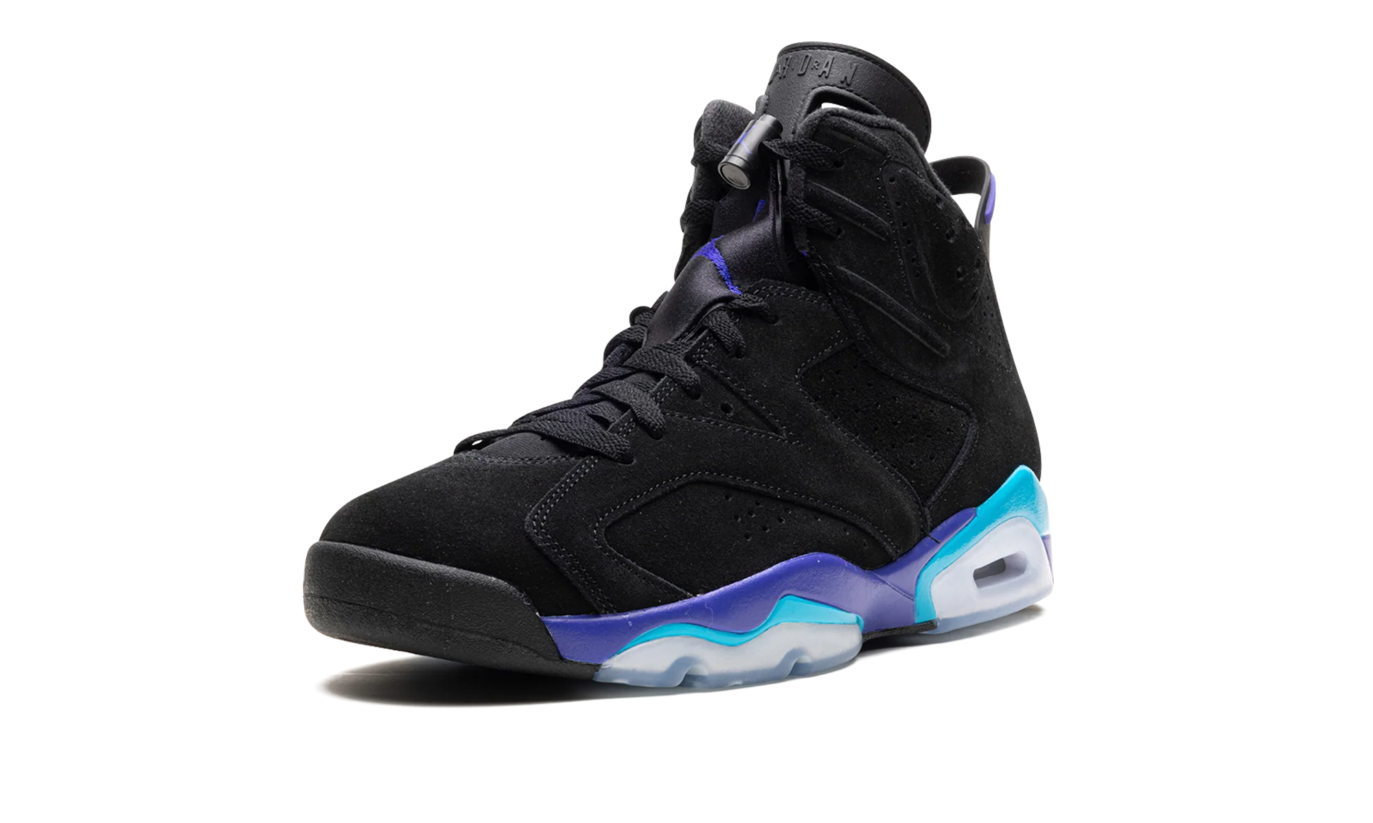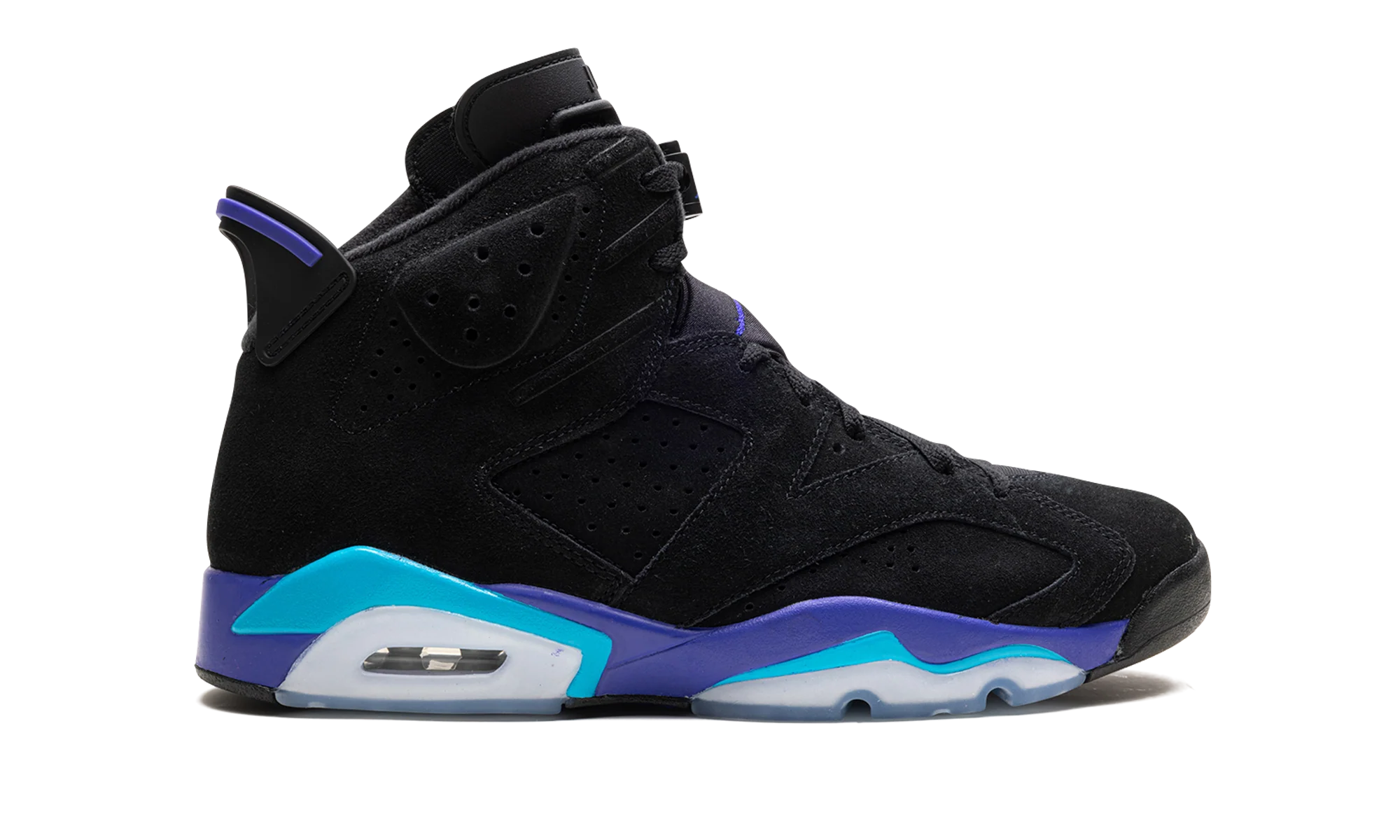 The Air Jordan 6 “Aqua” is a colorway of Michael Jordans sixth signature shoe inspired by an iconic Air Jordan design. The shoe in question is the Air Jordan 8 Aqua, an original colorway of the retro basketball sneaker that was worn by Jordan during the 1993 NBA All-Star Game. Jordan Brand transfers the Jordan 8 Aquas color scheme onto the Jordan 6 by featuring the shoes Bright Concord and Aquatone accents on the midsole. The upper features a black synthetic nubuck construction with tonal overlays. A Bright Concord Jumpman is embroidered on the tongue while a teal Jumpman is seen on the purple lace toggle. On the back of the shoe, a black spoiler with Aqua accents completes the look. Release date: October 7, 2023 Aqua