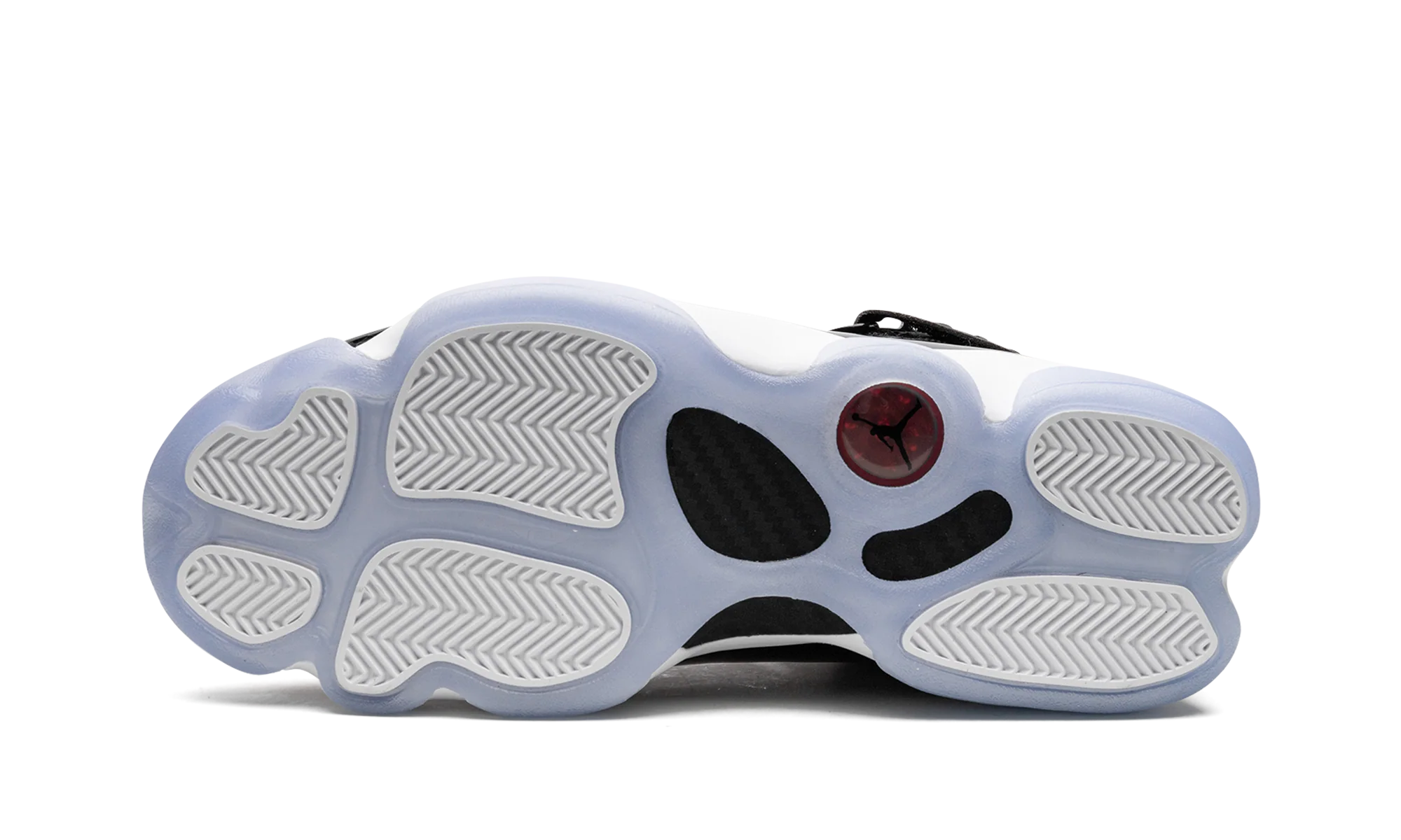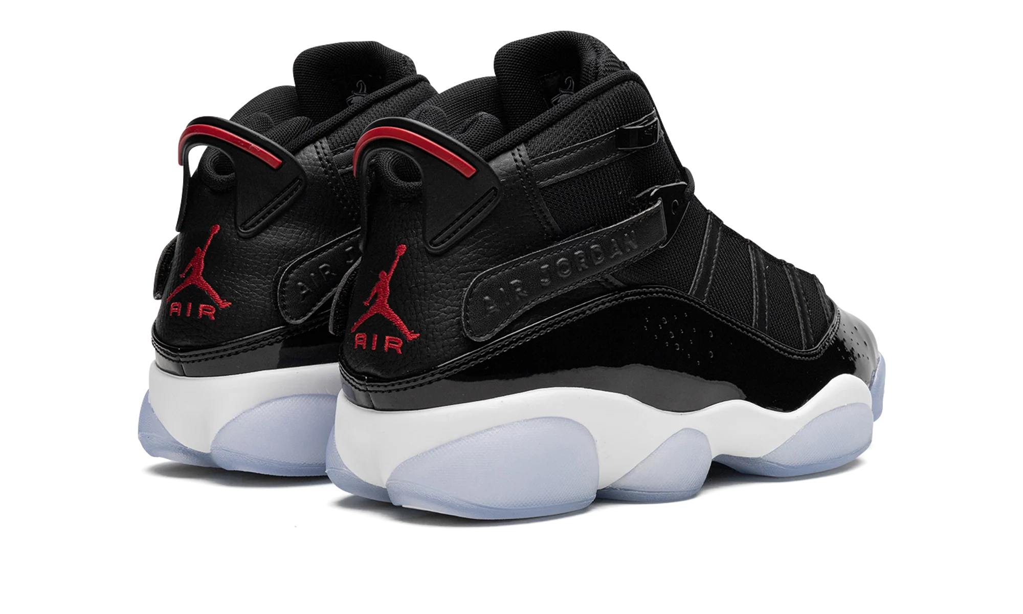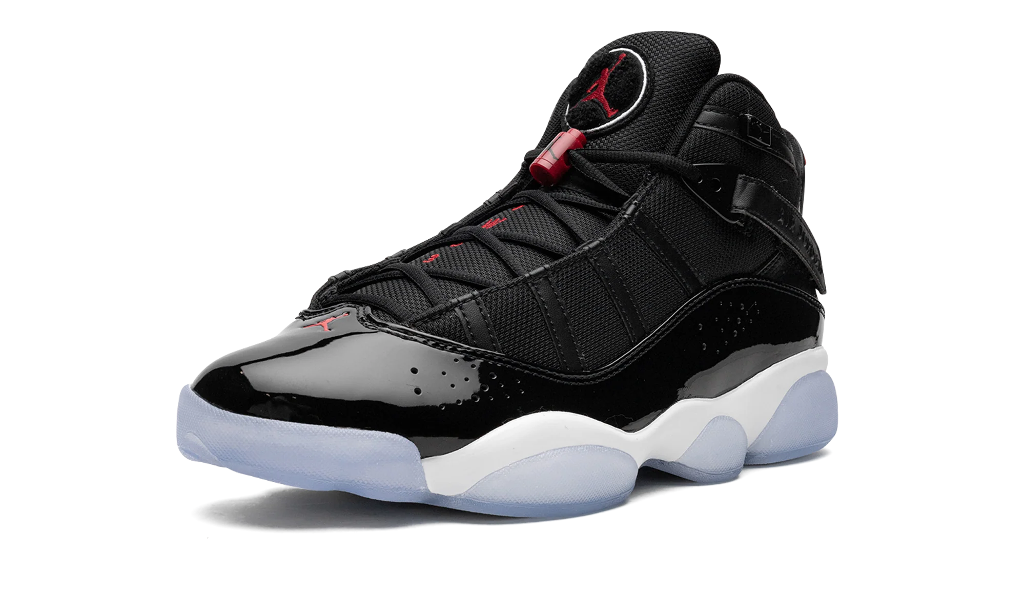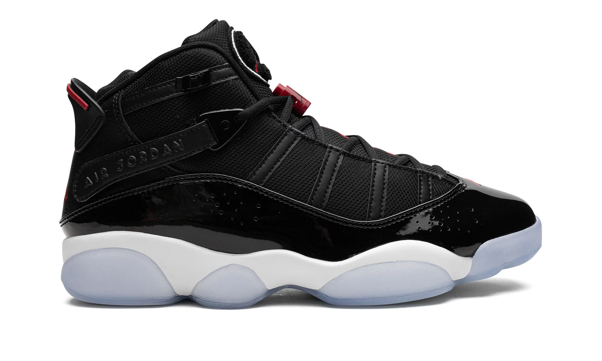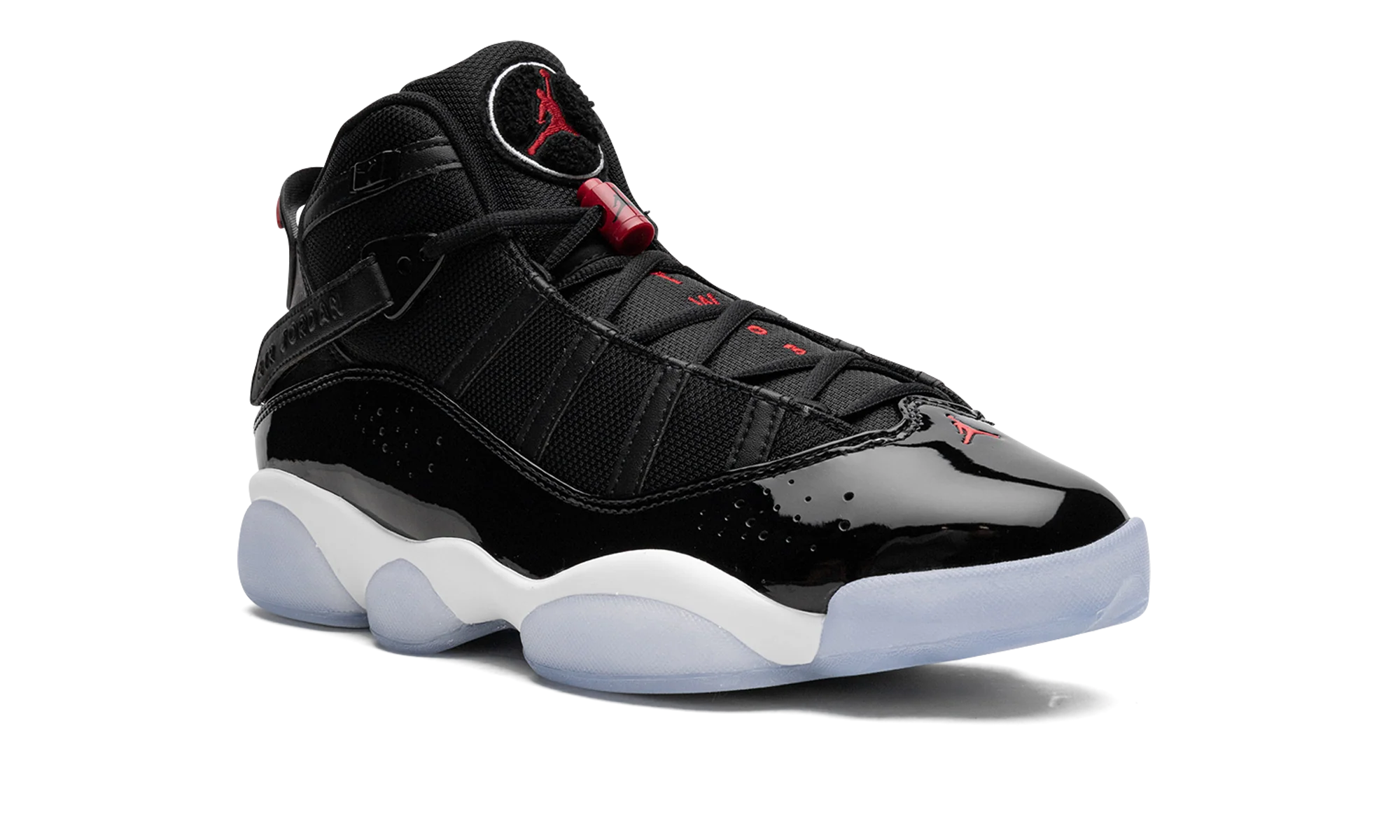 The Jordan 6 Rings Black/Gym Red is a Chicago Bulls-inspired colorway of the hybrid shoe that combines several design elements of classic Air Jordan sneakers. The Jordan 6 Rings debuted back in the 2000s, and is a shoe that combines elements of the six Jordan silhouettes that were worn by Michael Jordan when he won his six NBA Championships with the Bulls. Here, on the Black/Gym Red colorway, the shoe takes on a decidedly Bulls-esque look with a black mesh and leather upper. Contrasting Gym Red Jumpman and Two 3 branding appears on the tongue. A small red Jumpman is found on the vamp of the black patent leather mudguard. An icy blue translucent outsole completes the look. Release date: January 11, 2023