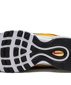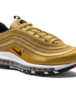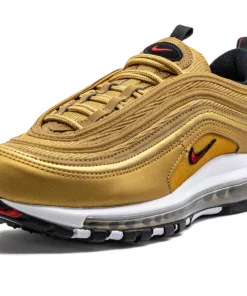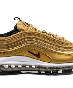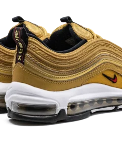 The Nike Air Max 97 “Gold Bullet” is a popular colorway of the retro performance running shoe that channels the vibe of the model’s “Silver Bullet” release. Like the “Silver Bullet,” the Air Max 97’s “Gold Bullet” colorway has an unmistakable design that draws attention everywhere it goes. The shoe’s base is featured in Metallic Gold, as are the wavy leather overlays that wrap around the shoe. A small University Red Swoosh appears on either side above the white foam midsole. The logo is also found on the circular black overlay on the tongue. Red “Air Max” detailing is printed on the heel tab. A full-length Max Air cushioning unit in the midsole completes the design. Gold Bullet 2023
