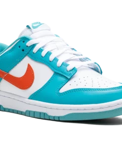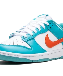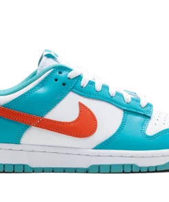 The Nike Dunk Low “Dolphins” is a colorway of the retro basketball sneaker that features the team uniform colors of the NFL’s Miami Dolphins. In no way officially affiliated with the Dolphins, the colorway nicknamed after the football team nonetheless salutes the squad by featuring its uniform colors on its design. The upper has a white leather base with aqua leather overlays. An orange leather Swoosh is seen on both sides of the shoe. “Nike” branding is embroidered in white lettering on the orange leather heel tab. Aqua “Nike” and Swoosh logos are seen on the tongue tag. A white rubber midsole and aqua rubber outsole complete the look. Dolphins