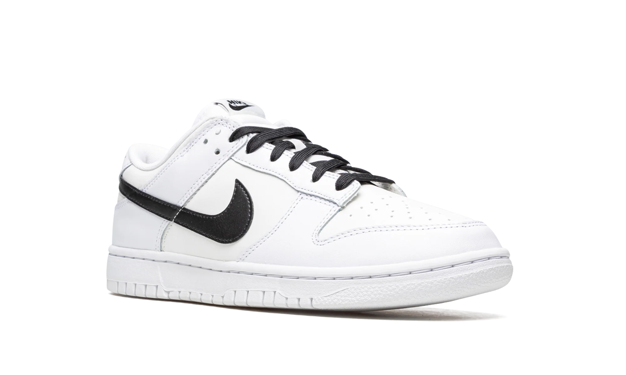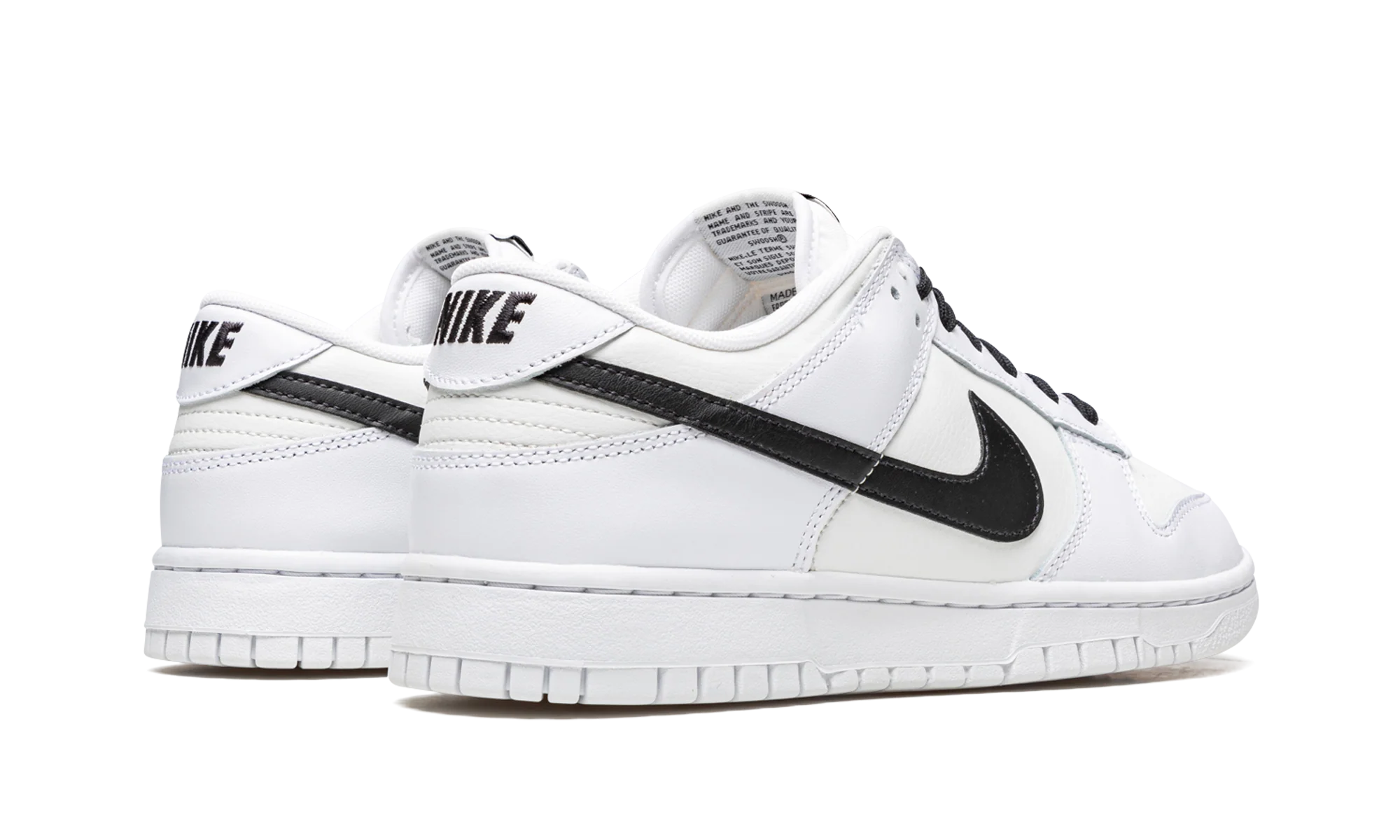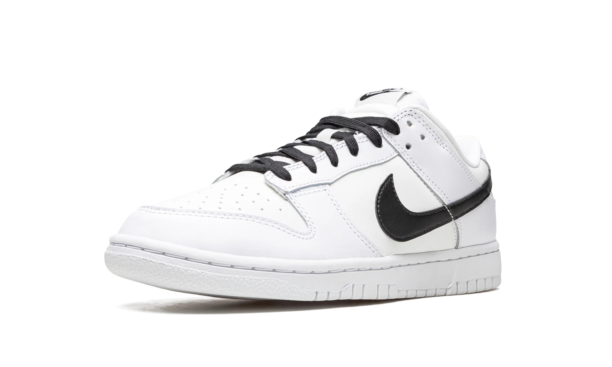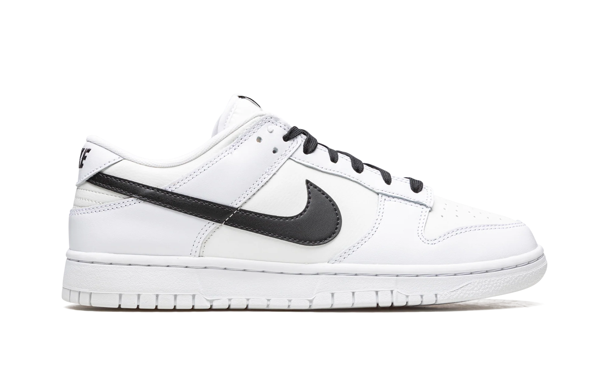 The Nike Dunk Low “Reverse Panda” is a two-tone, white-and-black colorway of the retro basketball shoe that flips the “Panda’s” color block. A clean, versatile look, the Dunk Low in the “Reverse Panda” makeup features a white leather upper with contrasting black leather on the Swoosh on either side of the shoe, on the “Nike” branding on the heel, and on the laces. Additional black accenting comes into play on the “Nike” and Swoosh detailing on the tongue tag. The shoe’s appearance is capped off with a white rubber sole. Reverse Panda