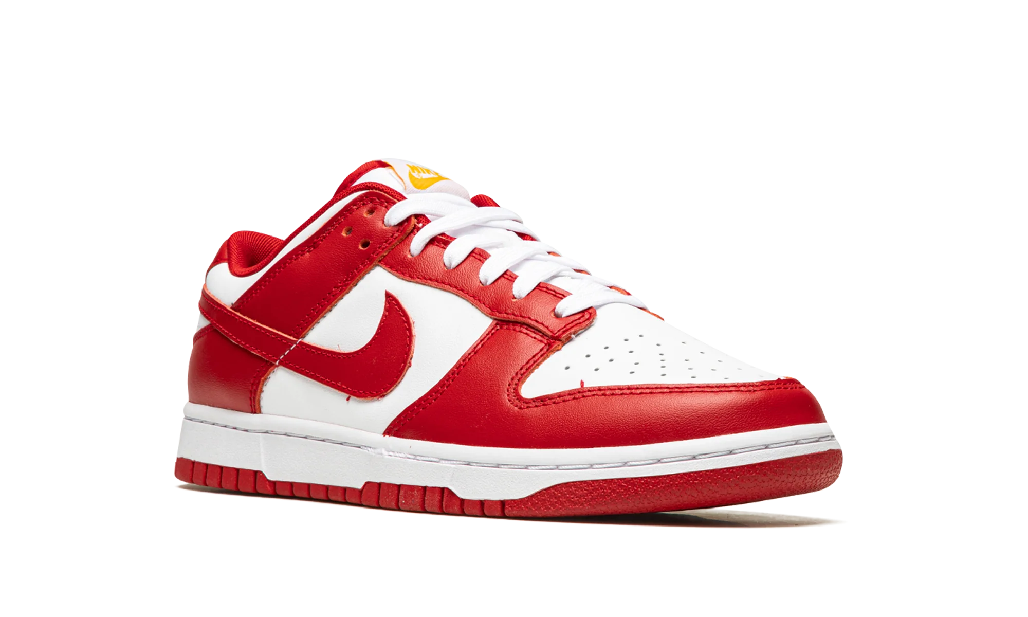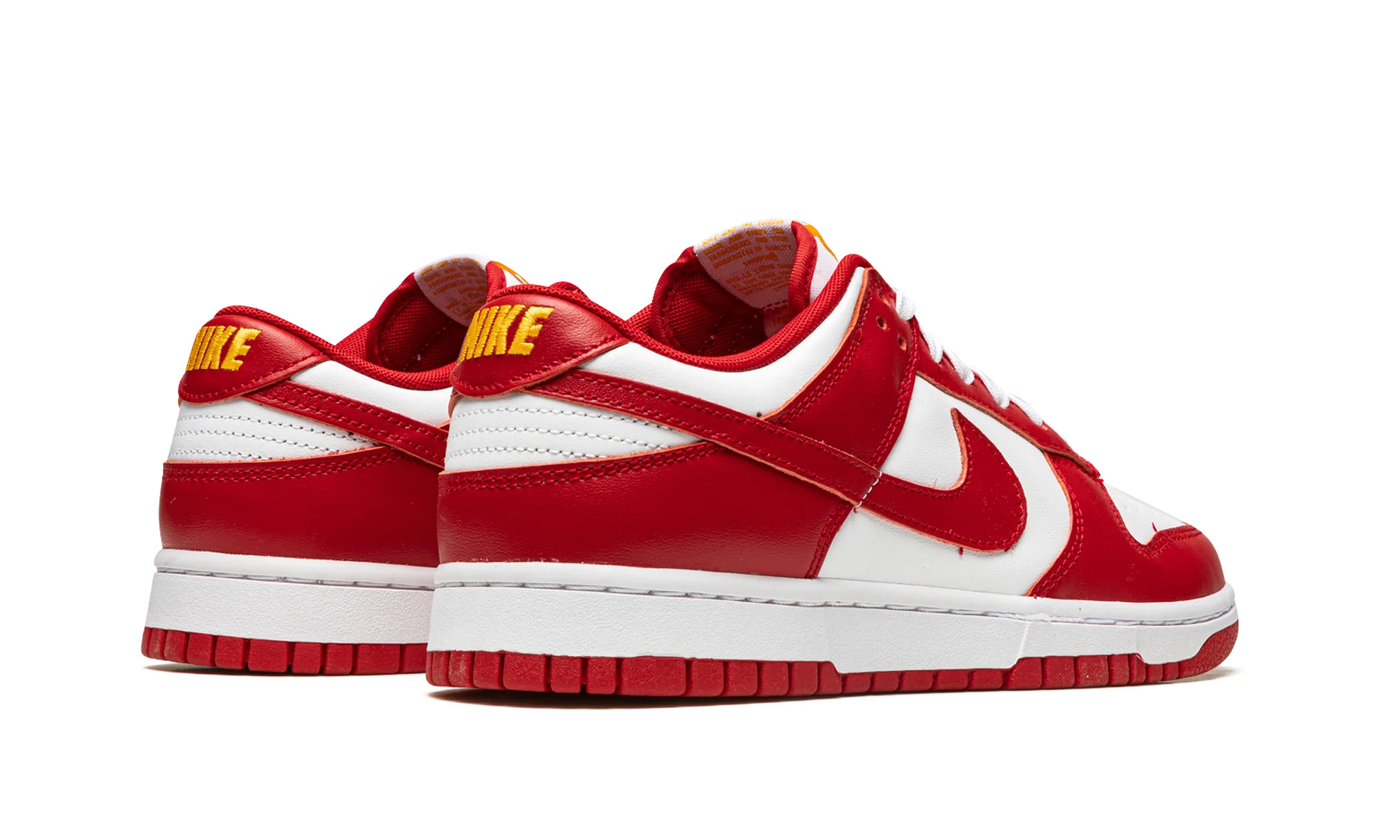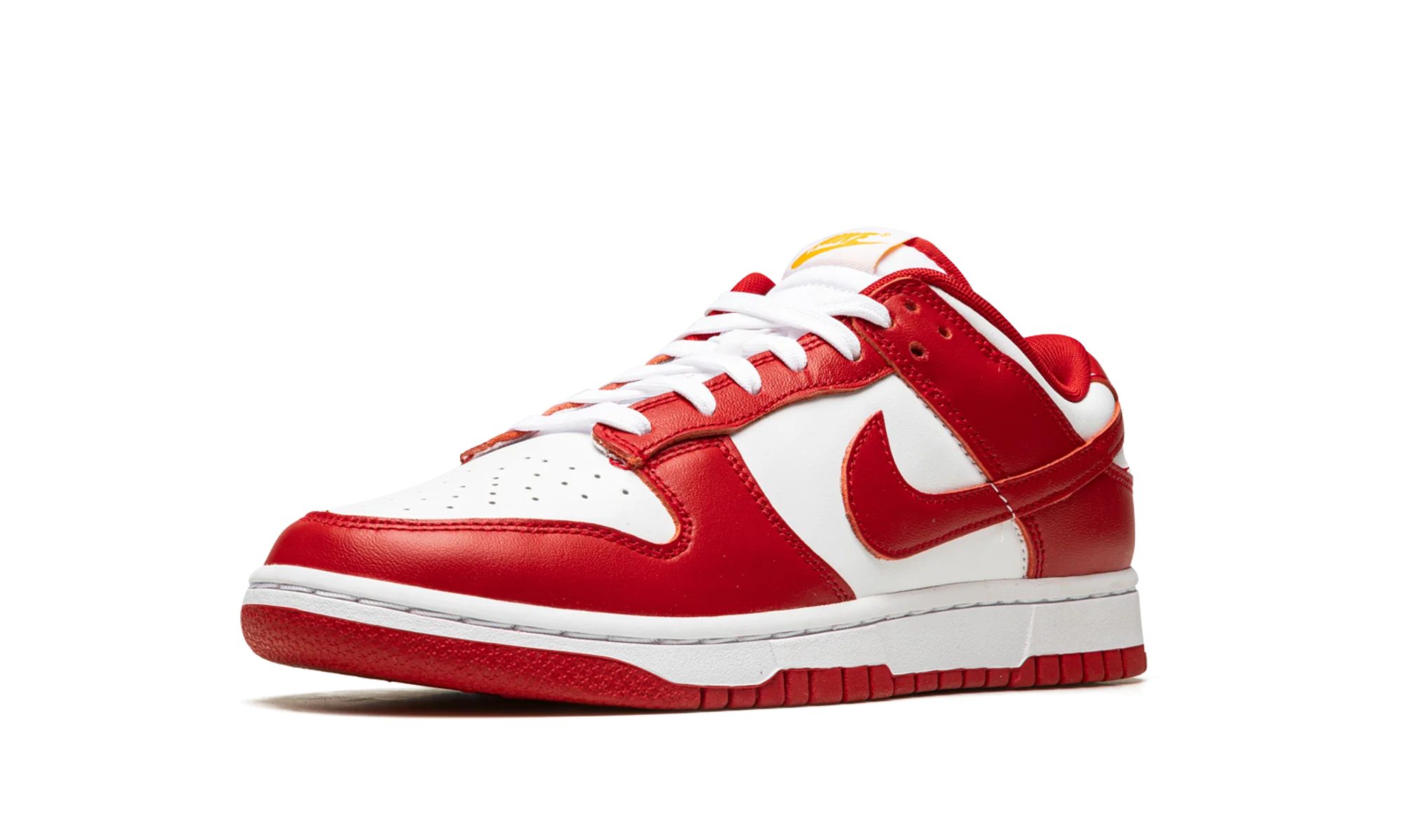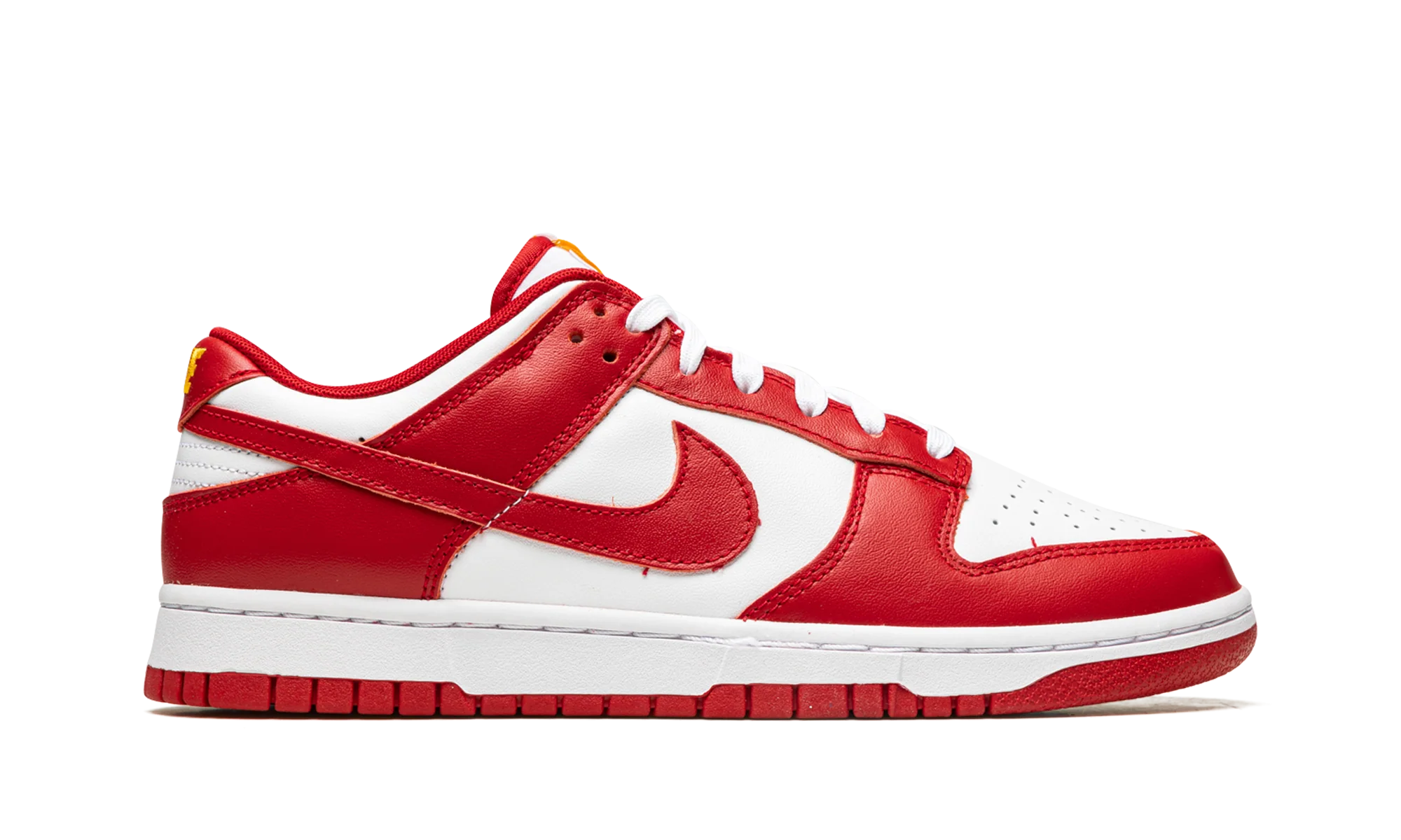 The Nike Dunk Low “USC” is a colorway of the retro basketball shoe that unofficially salutes the USC Trojans college basketball team. Based on the Trojans’ team uniform colors, the “USC” features a white leather base with contrasting Gym Red-colored leather overlays and Swoosh branding. Gold “Nike” detailing is embroidered on the heel. Additional gold accenting can be found on the “Nike” and Swoosh logos on the white nylon tongue tag. A white rubber midsole and Gym Red outsole finish off the look. The “USC” is one of many classic Dunks designed in the spirit of popular college basketball teams. USC