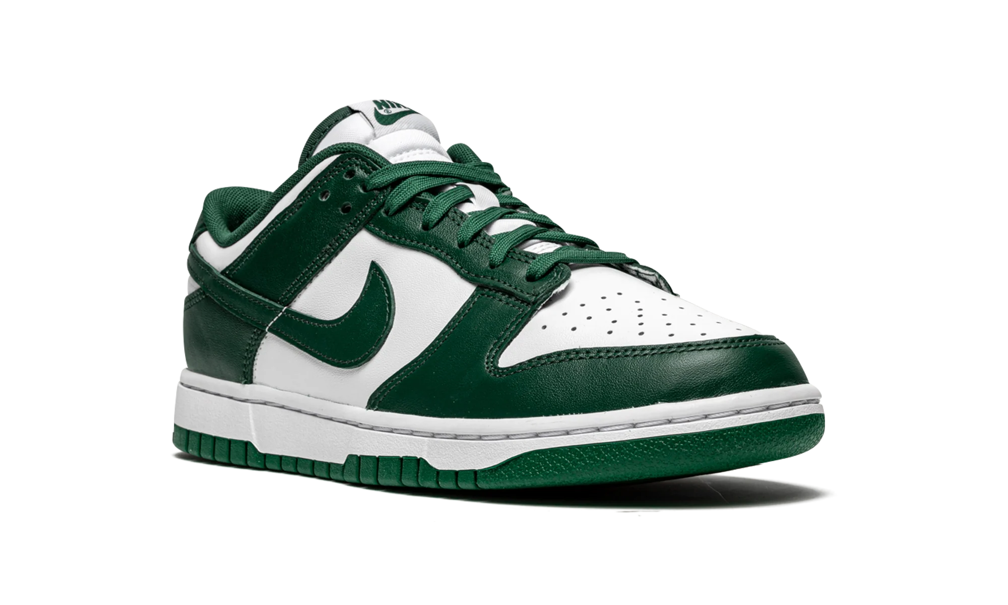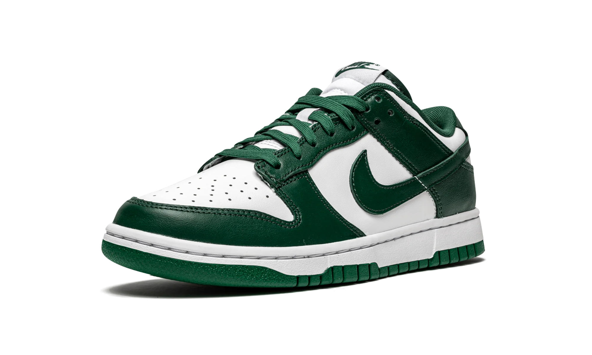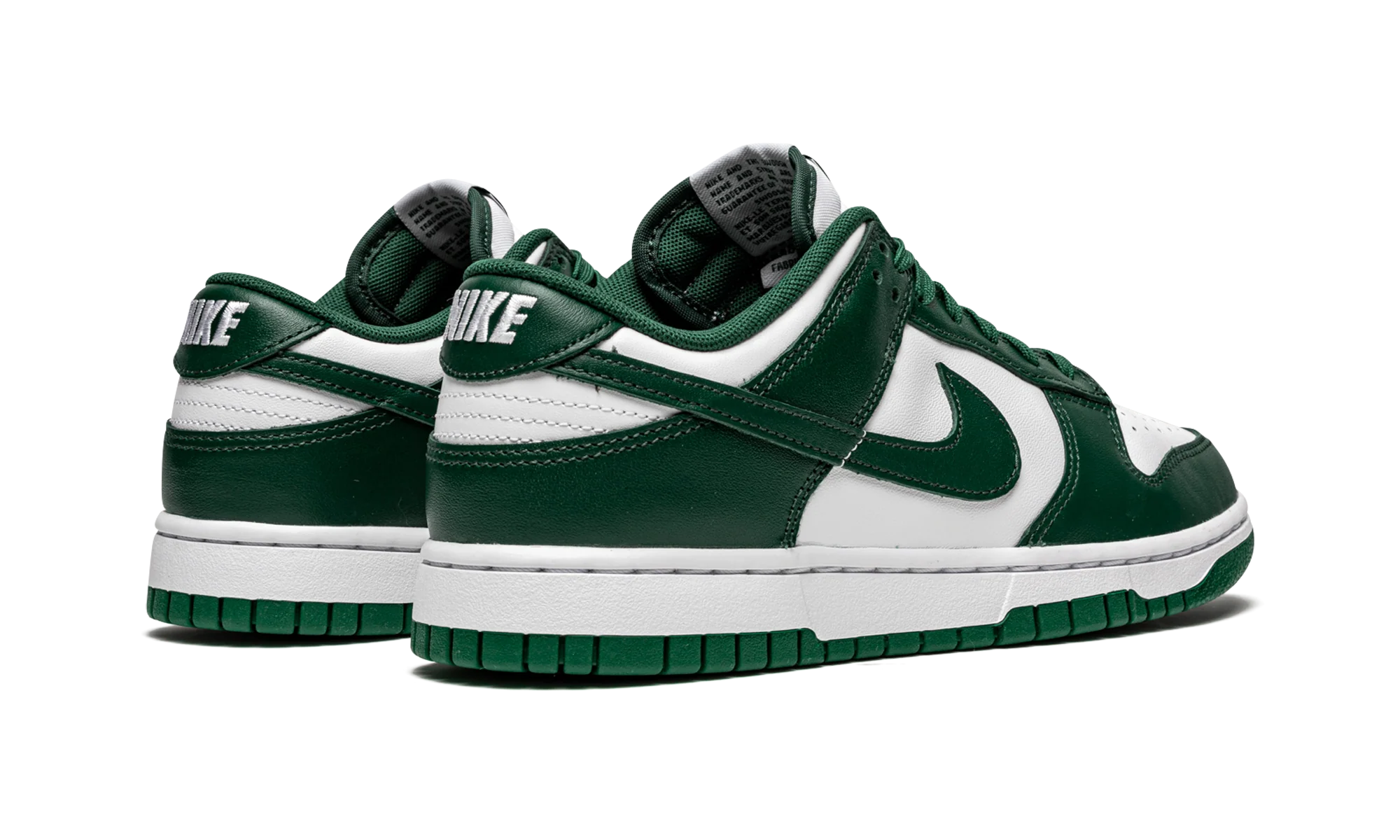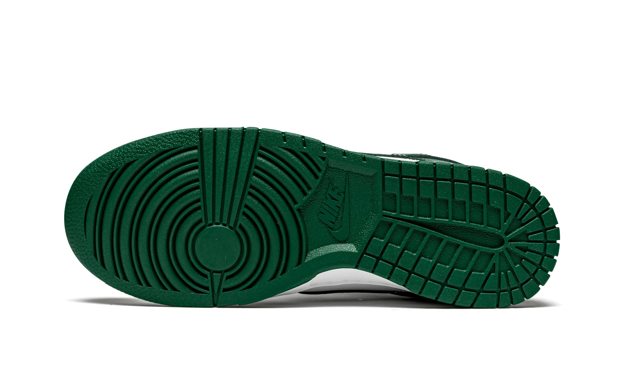 The Nike Dunk Low “Team Green” is based on team uniform colors of the Michigan State Spartans college basketball team. The “Team Green” is inspired by Nike’s original “Be True to Your School” pack that was dedicated to some of the top college basketball programs in the country during the mid-to-late 1980s. In 2020, Nike released the “Spartan Green” Dunk High, which is basically a high-top version of the “Team Green” seen here. Like the aforementioned design, the “Team Green” features a white leather base with contrasting Team Green leather overlaid panels. A green leather Swoosh appears on either side and white “Nike” detailing is embroidered on the heel. Green laces are layered over the white nylon tongue. A white midsole and green outsole finish off the look of the Nike Dunk Low based on the color block of the Michigan State Spartans’ team uniforms. Release date: April 16, 2021. Team Green