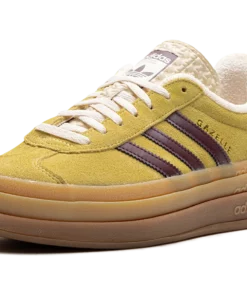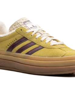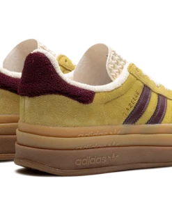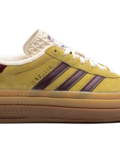 The Women’s adidas Gazelle Bold “Yellow/Burgundy” is a women’s-exclusive colorway of the retro shoe with a platform-style sole and other modifications. The contemporary-looking adidas Gazelle Bold features a triple-stacked, raised sole. As for the rest of the design, the shoe features a mustard yellow suede upper with burgundy leather Three Stripes on the sides. Gold “Gazelle” branding is seen on the lateral side of the shoe. The burgundy terry cloth heel tab matches the material used on the shoe’s inner lining. A stacked gum rubber sole completes the look.