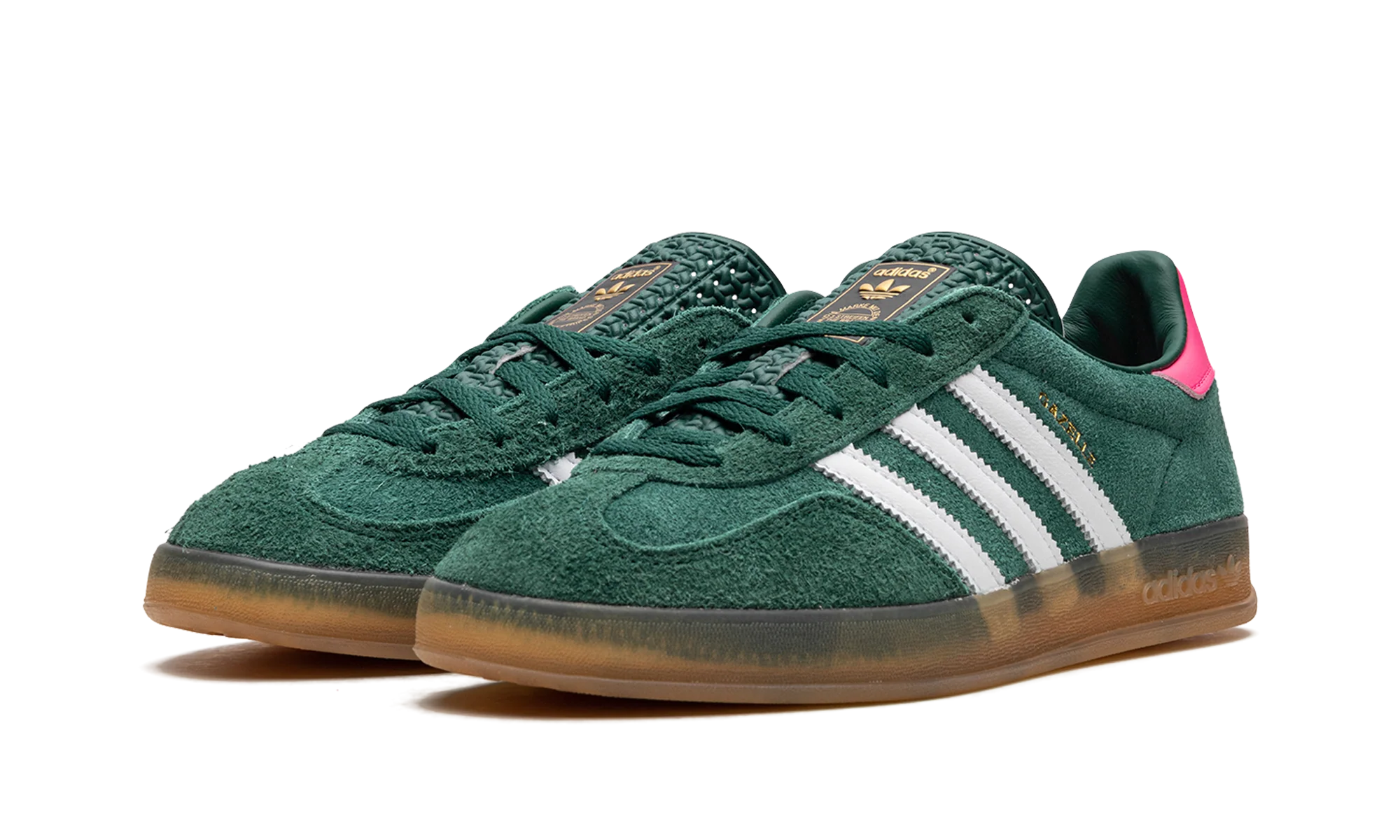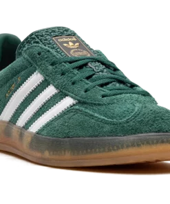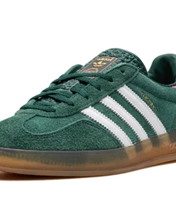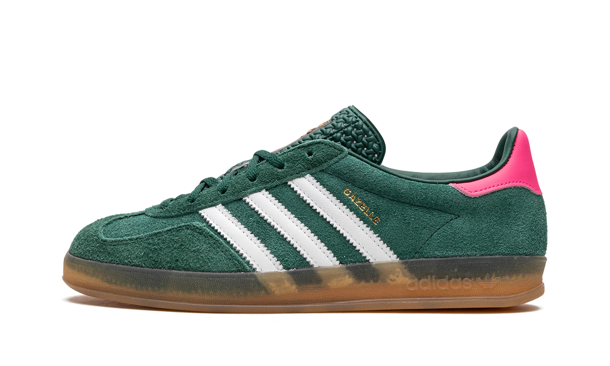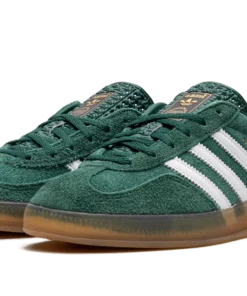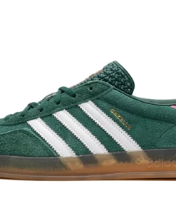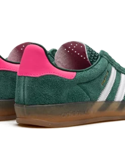 The Women’s adidas Gazelle Indoor “Collegiate Green/Lucid Pink” is a women’s-exclusive colorway of the retro indoor soccer shoe that turns heads with a green-and-pink design. An eye-grabbing colorway, the Gazelle Indoor in “Collegiate Green/Lucid Pink” features a green suede upper contrasted with white leather Three Stripes detailing on both sides. A gold “Gazelle” logo can be found on the lateral side of the shoe. Lucid Pink leather appears on the heel tab. A classic “adidas” logo is seen on the tongue. Underfoot, a semi-translucent gum rubber sole completes the look. Collegiate Green / Lucid Pink