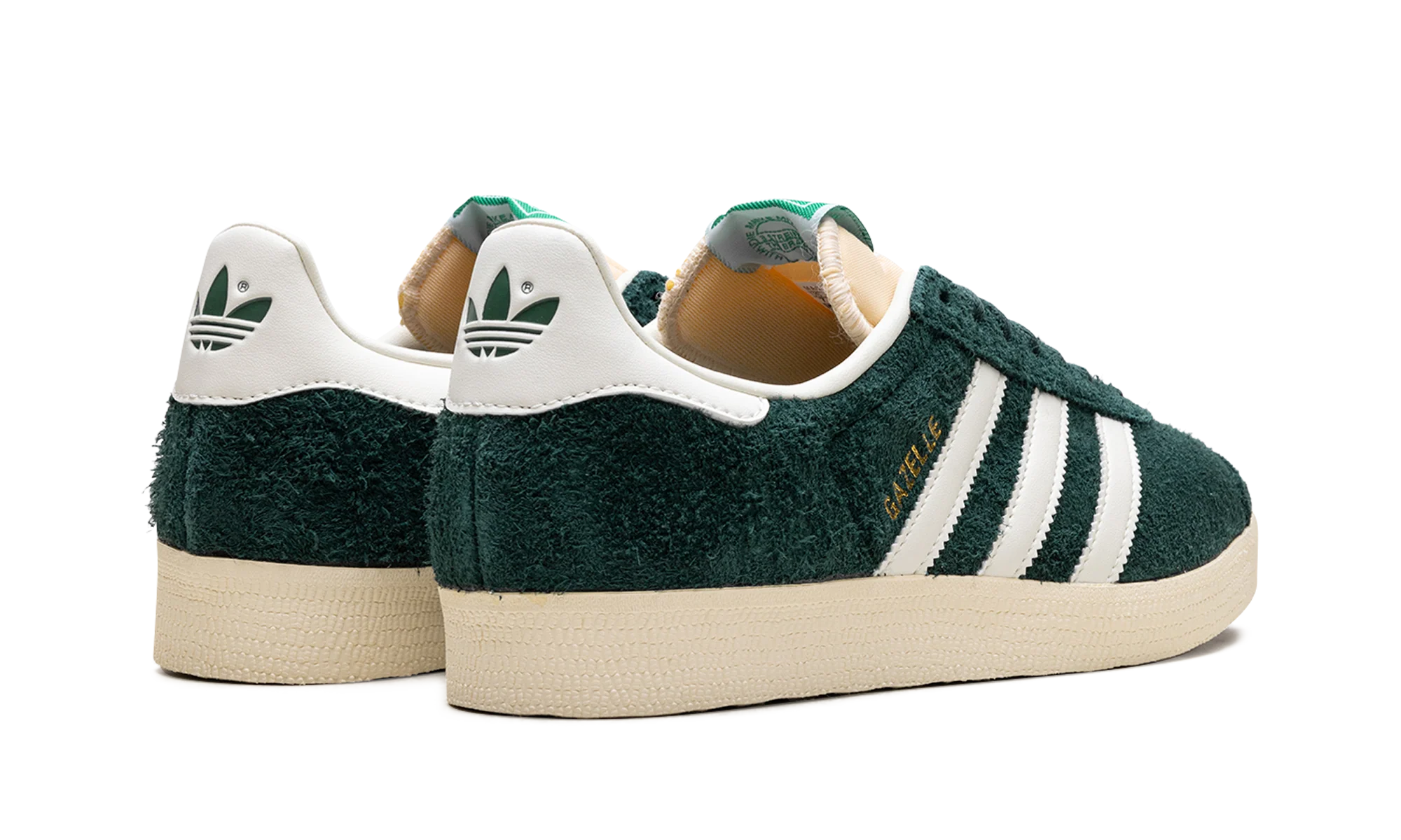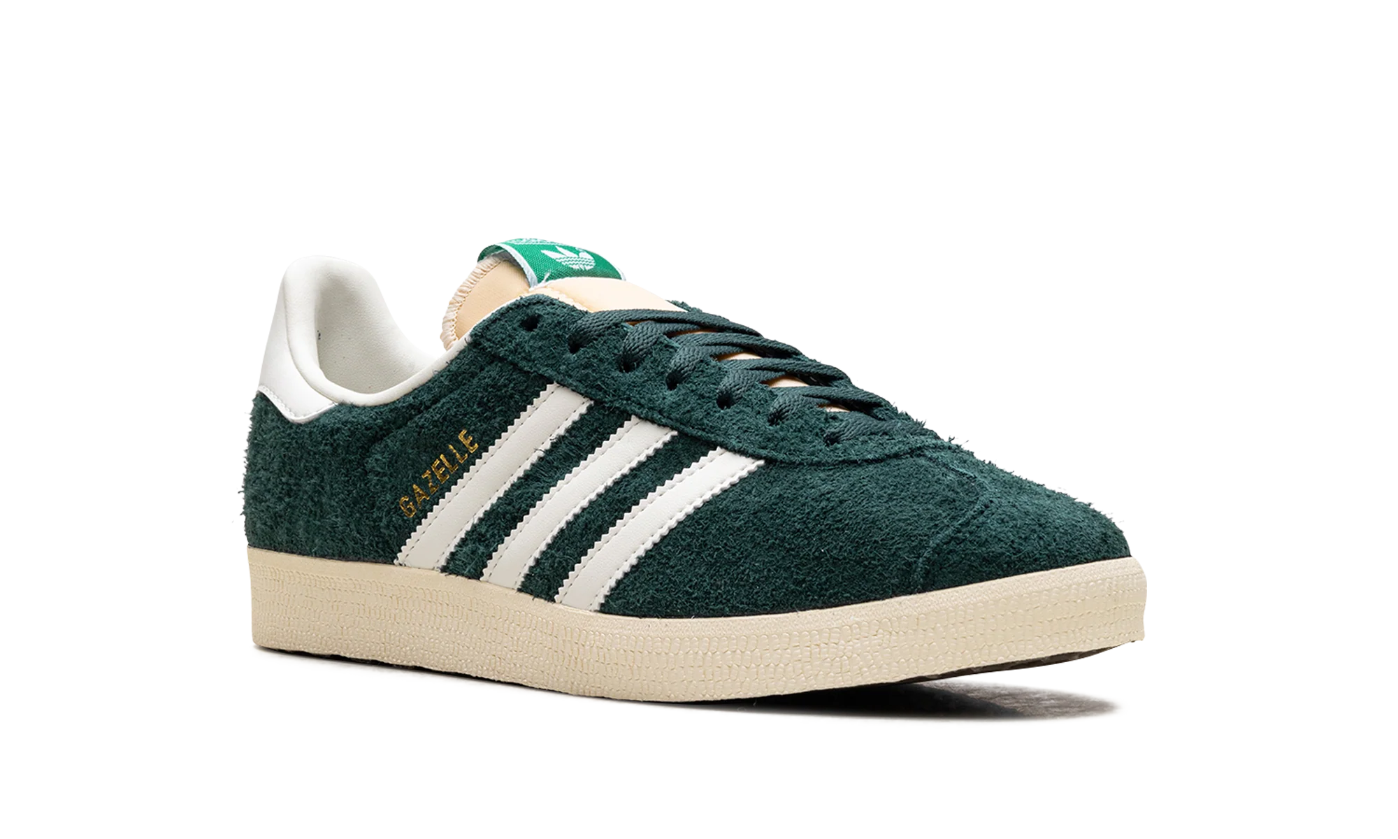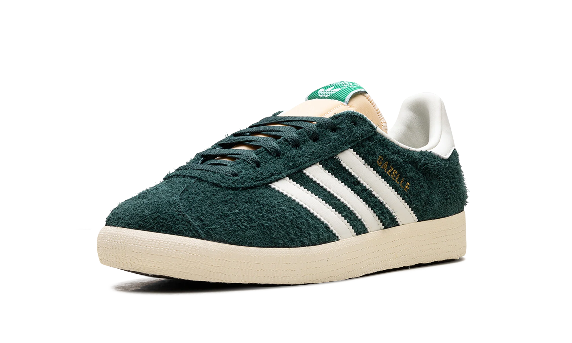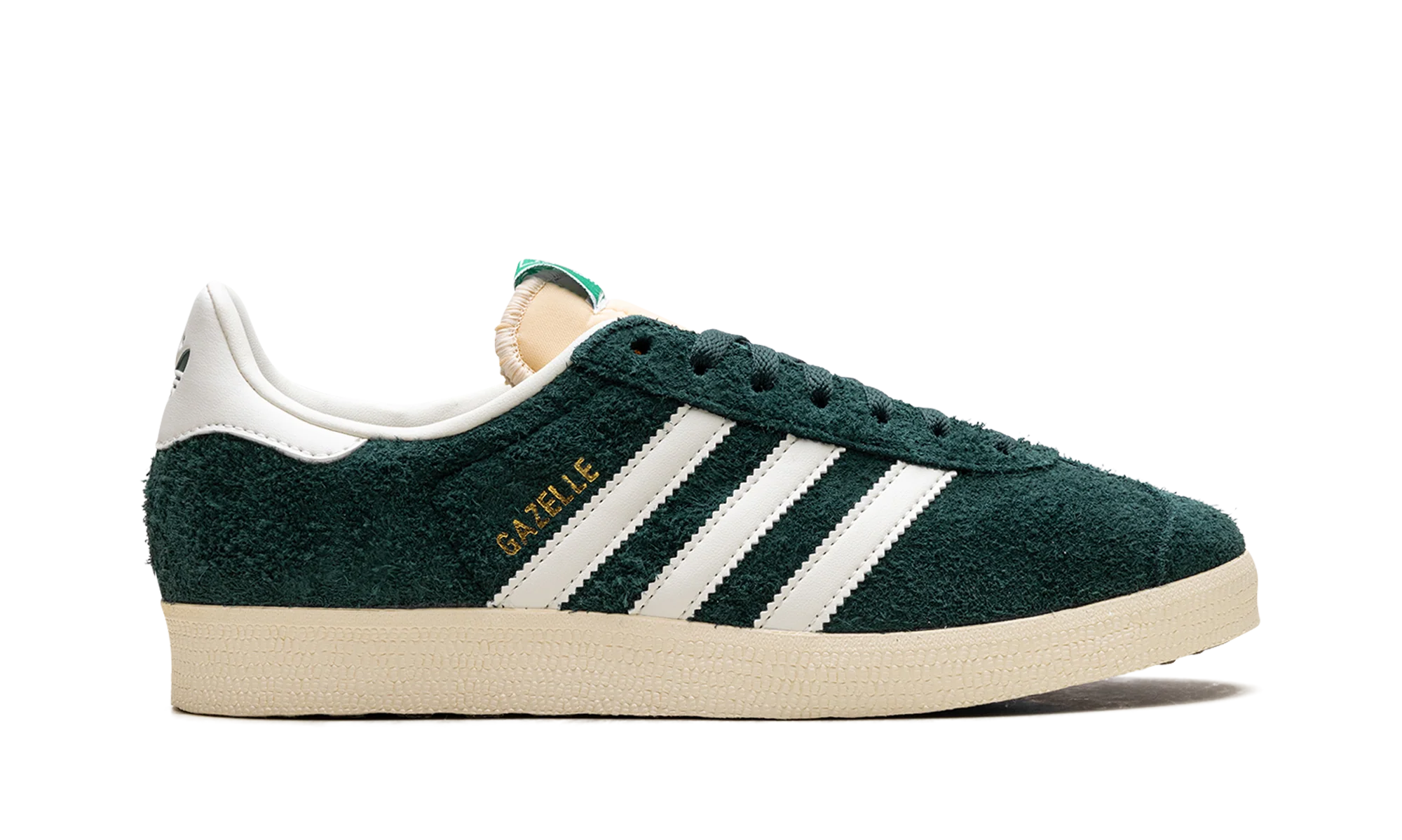 Walk in the footsteps of history with the Adidas Gazelle, an indoor classic redefined in the elegant “Mineral Green” colorway. This timeless icon honors the beloved 1991 version with a plush and supple suede upper and signature serrated 3-Stripes in contrasting off-white. The low-profile silhouette features an iconic T-toe and is grounded by a traditional rubber outsole, offering dependable grip. The eye-catching colors and gold foil ‘Gazelle’ lettering lend modern style to this retro favorite.