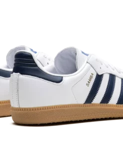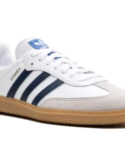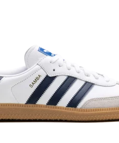 The adidas Samba OG “White/Night Indigo” is a colorway of the retro shoe with navy accents. The adidas Samba OG is one of the most popular sneakers in the world due to its versatility and comfort. Here, the “White/Night Indigo” features a white leather base and a grey suede overlay on the toe. The Three Stripes branding on the sides appears in a Night Indigo tone, while a gold foil “Samba” logo can be seen on the lateral side of the mid-panel. Classic adidas Samba detailing is printed on the tongue. A gum rubber sole completes the look. Cloud White Night Indigo