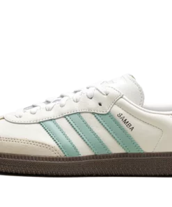 The Women’s adidas Samba OG “Hazy Green” is a women’s-exclusive colorway of the retro soccer shoe with green features. The upper is complete with a Cloud White leather design and Hazy Green leather Three Stripes branding. Wonder White accenting appears on the leather overlays on the toe and heel. Classic “Samba” branding can be found on the lateral side of the mid-panel, while “adidas” branding appears on the tongue. Underfoot, a dark gum rubber sole completes the look. Hazy Green