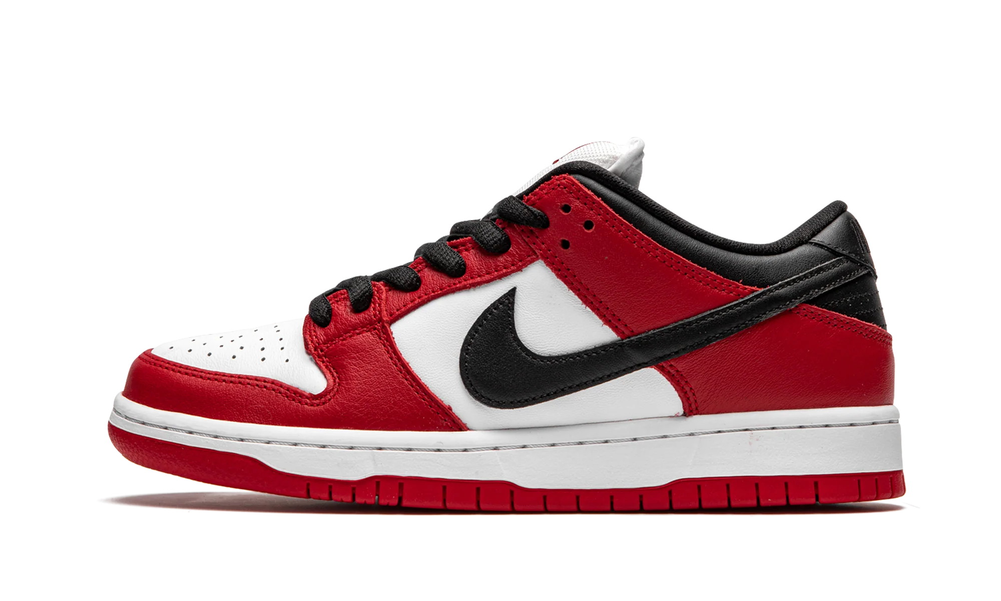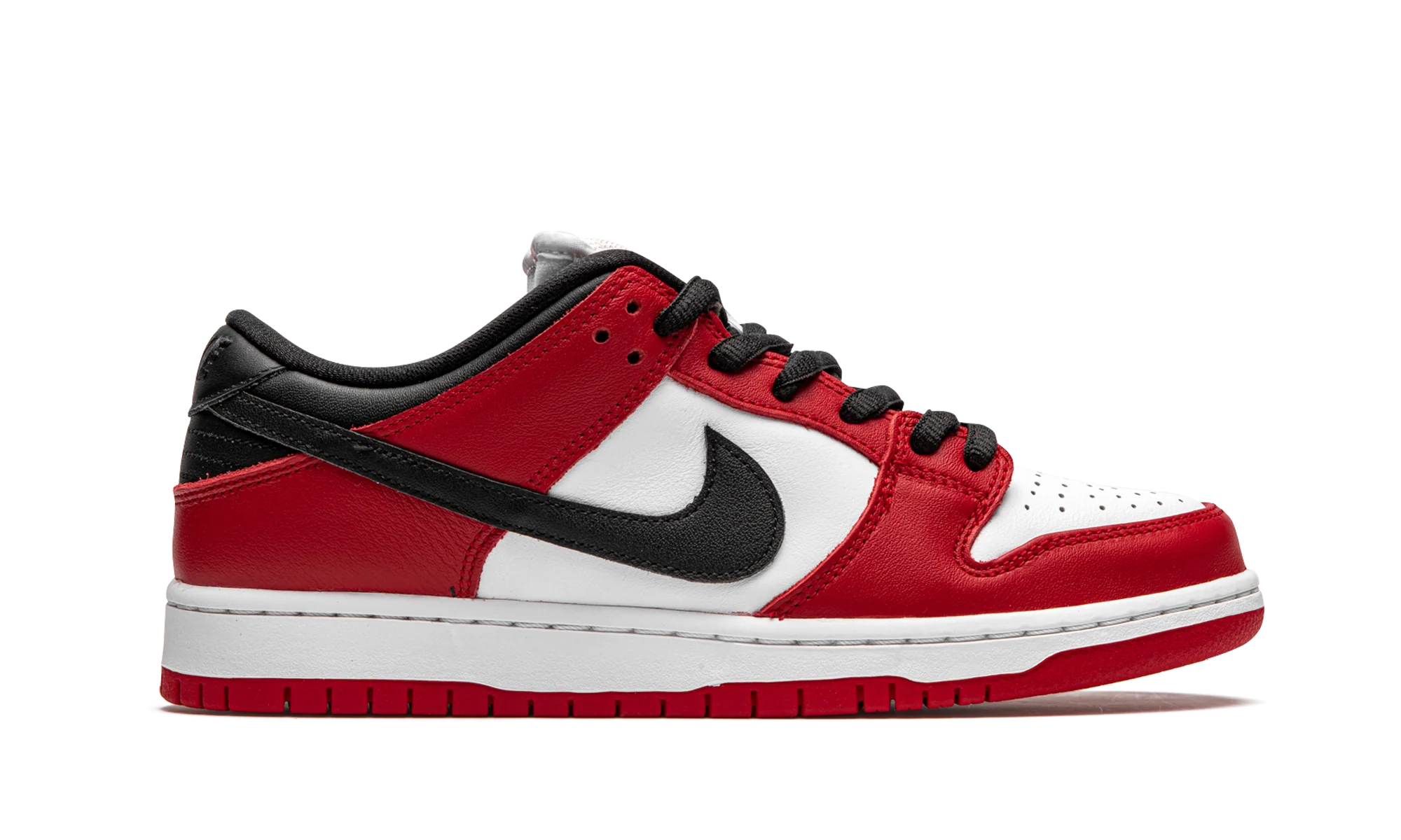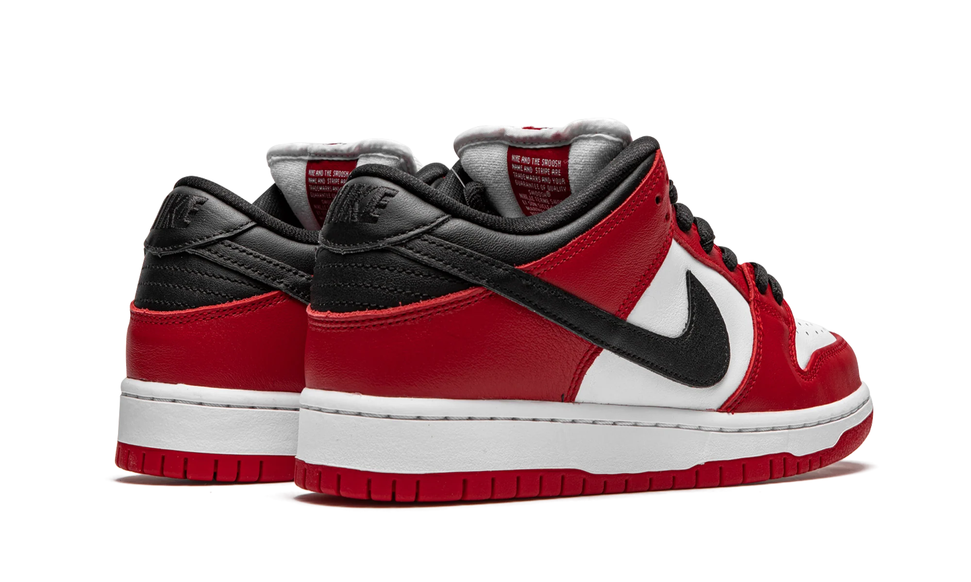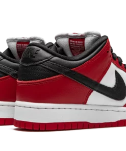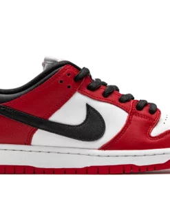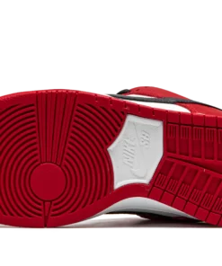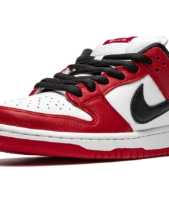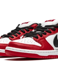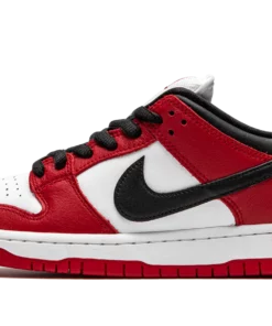 The Nike SB Dunk Low “Chicago” is dedicated to the styling and color block used on the original Air Jordan 1 of the same nickname from 1985. A tribute to Michael Jordan’s all-time classic signature shoe, this “Chicago” Dunk is almost a spitting image of the Jordan 1 Low. The two distinctly retro silhouettes are a product of Nike’s mid-80s performance basketball footwear campaign. The skate-adjacent Dunk features a white leather perforated toe with white leather mid-panel walls. Fiery red leather overlays dot the forefoot, eyelets, and heel. Branding appears in the form of a black leather Swoosh on either side of the shoe, tonal “Nike” embroidery on the heel, and white accenting Nike SB detailing on the red nylon tongue tag. Given that this is the skateable version of the Dunk, the shoe displays a puffy white mesh tongue for impact absorption. Finishing touches include black cotton laces and a two-toned white midsole and red outsole. Release date: Fall 2020. Chicago