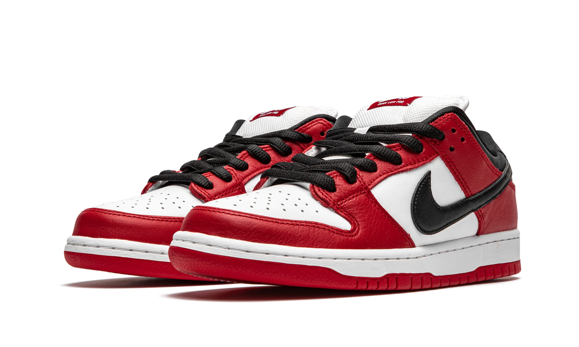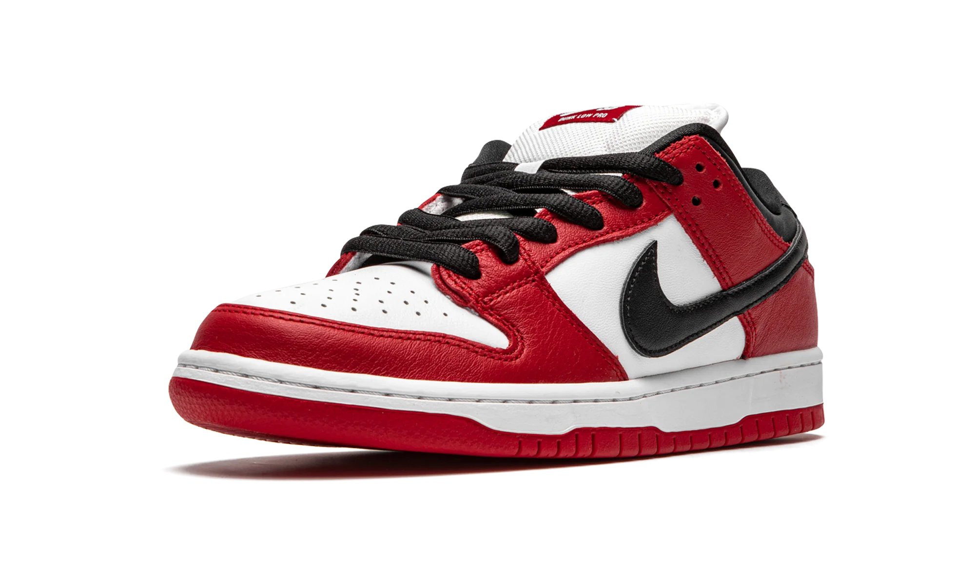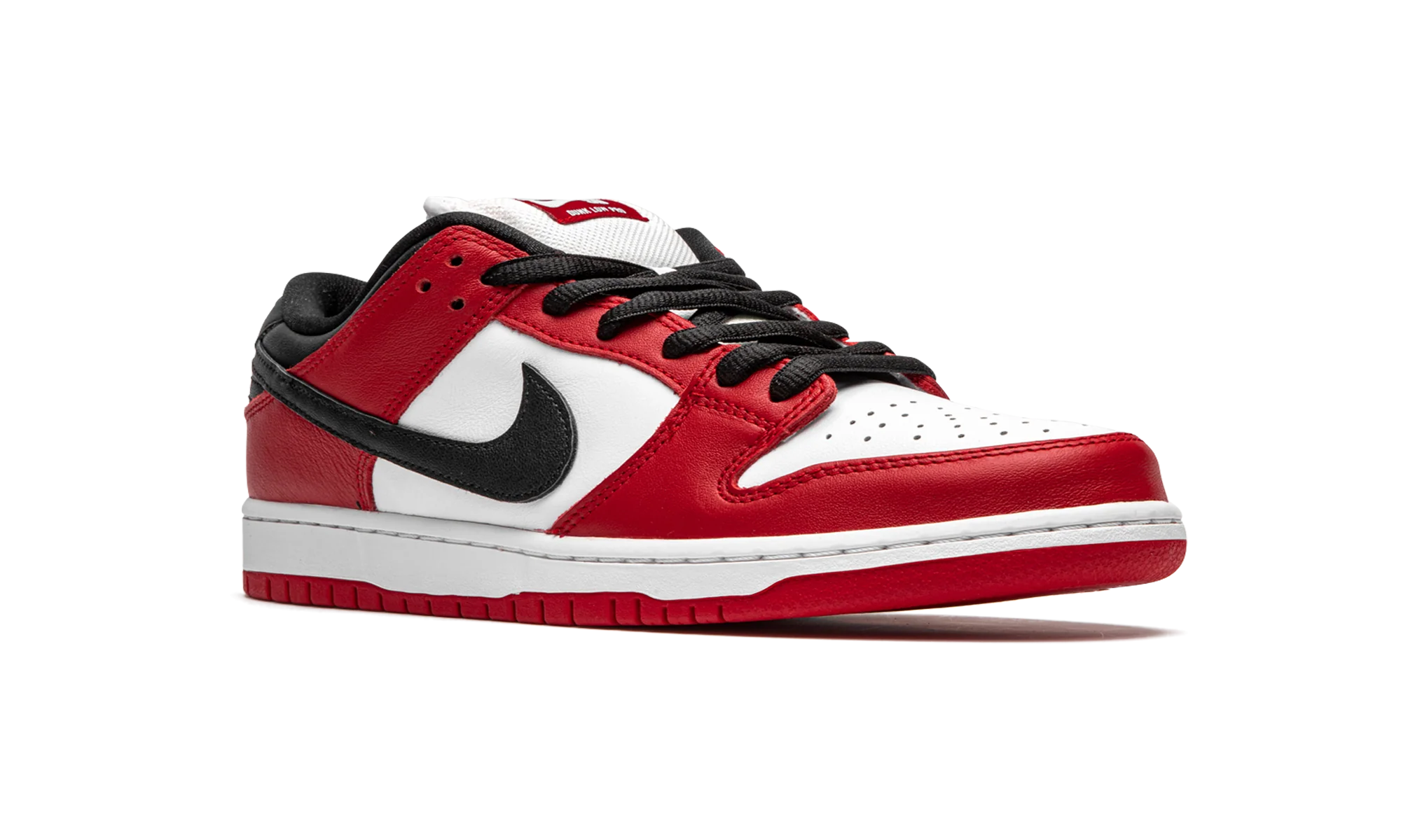 The Nike SB Dunk Low “Chicago” is dedicated to the styling and color block used on the original Air Jordan 1 of the same nickname from 1985. A tribute to Michael Jordan’s all-time classic signature shoe, this “Chicago” Dunk is almost a spitting image of the Jordan 1 Low. The two distinctly retro silhouettes are a product of Nike’s mid-80s performance basketball footwear campaign. The skate-adjacent Dunk features a white leather perforated toe with white leather mid-panel walls. Fiery red leather overlays dot the forefoot, eyelets, and heel. Branding appears in the form of a black leather Swoosh on either side of the shoe, tonal “Nike” embroidery on the heel, and white accenting Nike SB detailing on the red nylon tongue tag. Given that this is the skateable version of the Dunk, the shoe displays a puffy white mesh tongue for impact absorption. Finishing touches include black cotton laces and a two-toned white midsole and red outsole. Release date: Fall 2020. Chicago
